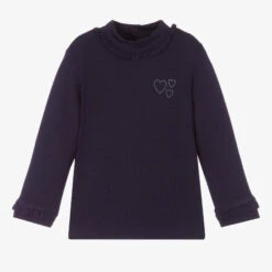Navy blue turtleneck top for little girls by Mayoral, made in soft viscose jersey. The neck and cuffs have sweet ruffle trims and there is a glittery blue heart print on the chest. It fastens easily with poppers on the back.