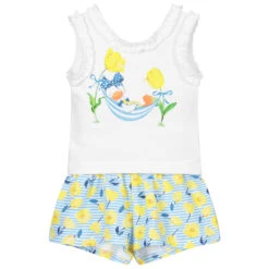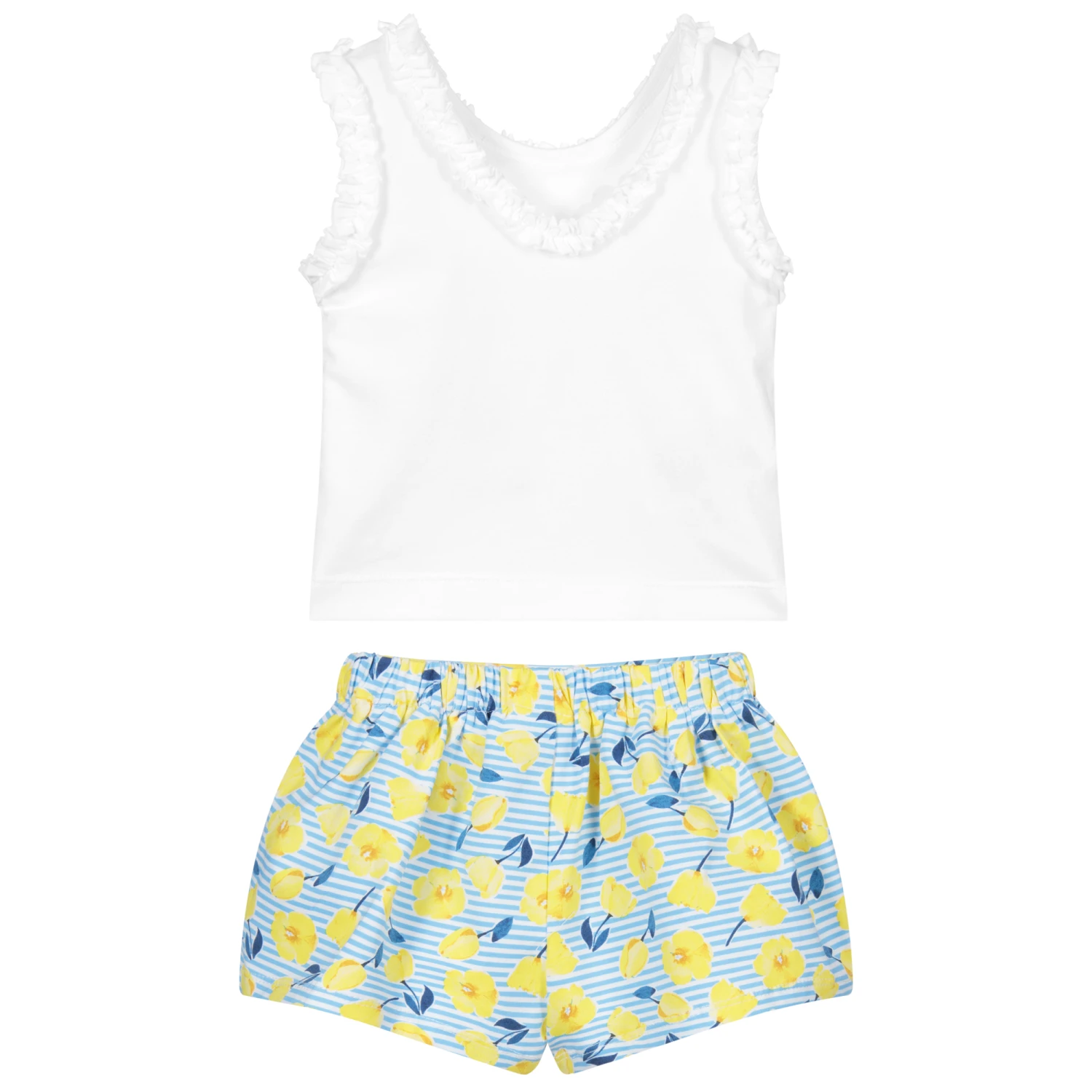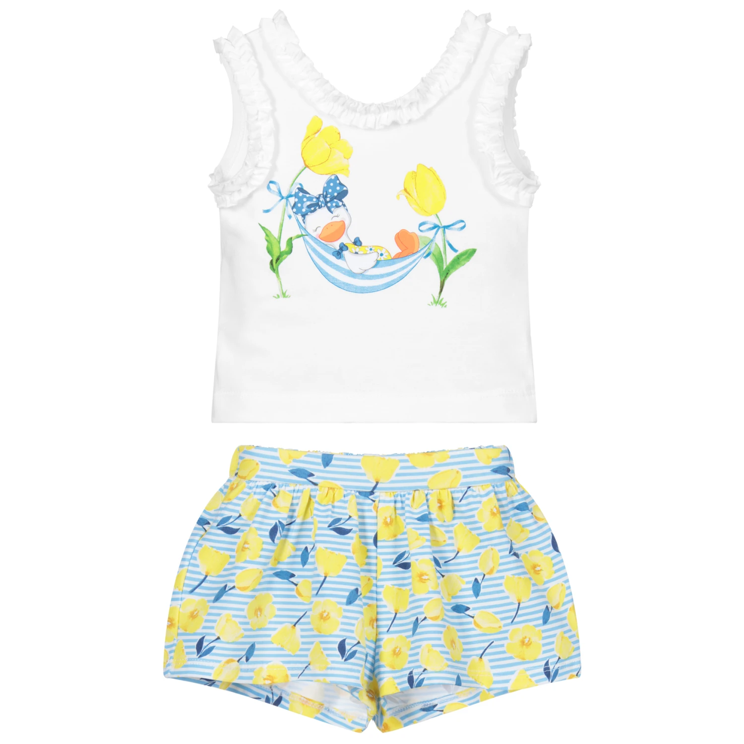 A fun top and shorts set for little girls by Mayoral, made in soft cotton jersey. The white T-shirt has a blue, white and yellow duck and flower print on the front, with ruffled trims. The blue and white striped shorts are patterned with yellow flowers and have an elasticated waistband.