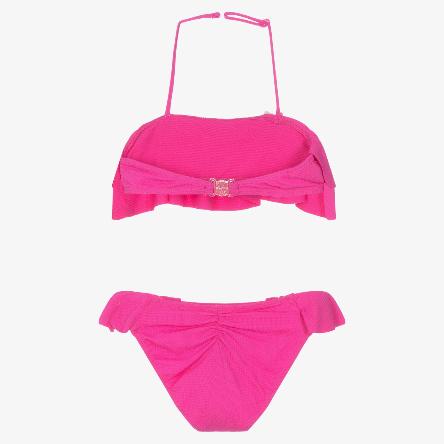 A fuchsia pink bikini for girls by Mayoral. Soft and stretchy, this bikini features a matching top and bottom with frill detailing on the chest and waistline. The halterneck strap can be easily adjusted and the clips on the back interlock for a comfortable and secure fit. There is a pink and silver fruit appliqué on the chest decorated with iridescent sequins for a touch of sparkle.