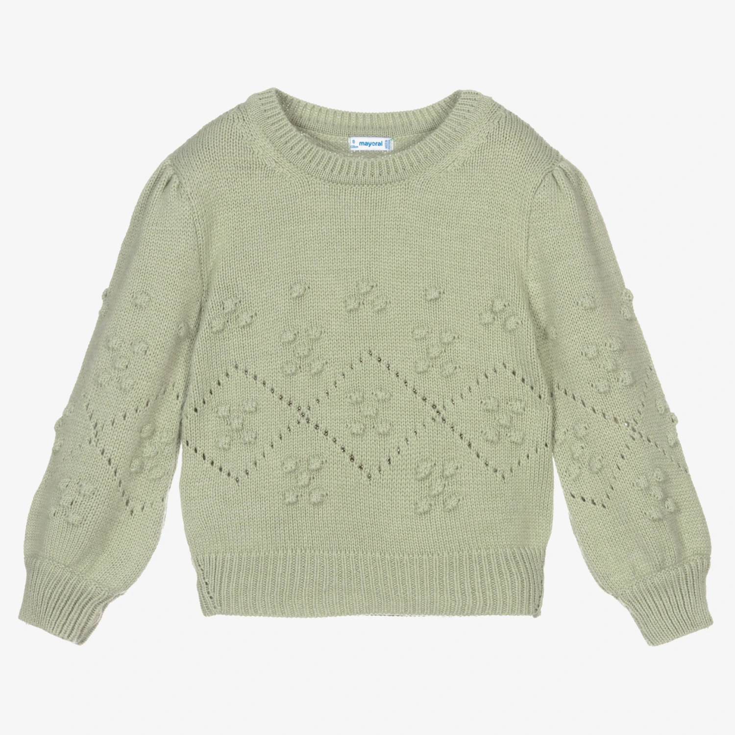 Green sweater for girls by Mayoral, with a pretty bobble and eyelet pattern. Knitted in a super soft acrylic and polyester blend with recycled fibres, it has full, puffed sleeves and ribbed trims.