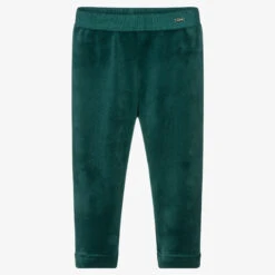 Dark green velour leggings by Mayoral for younger girls, made in soft, cosy velour. They have a comfortable, elasticated waistband ideal for little tummies, and a small silver logo tab on one side.