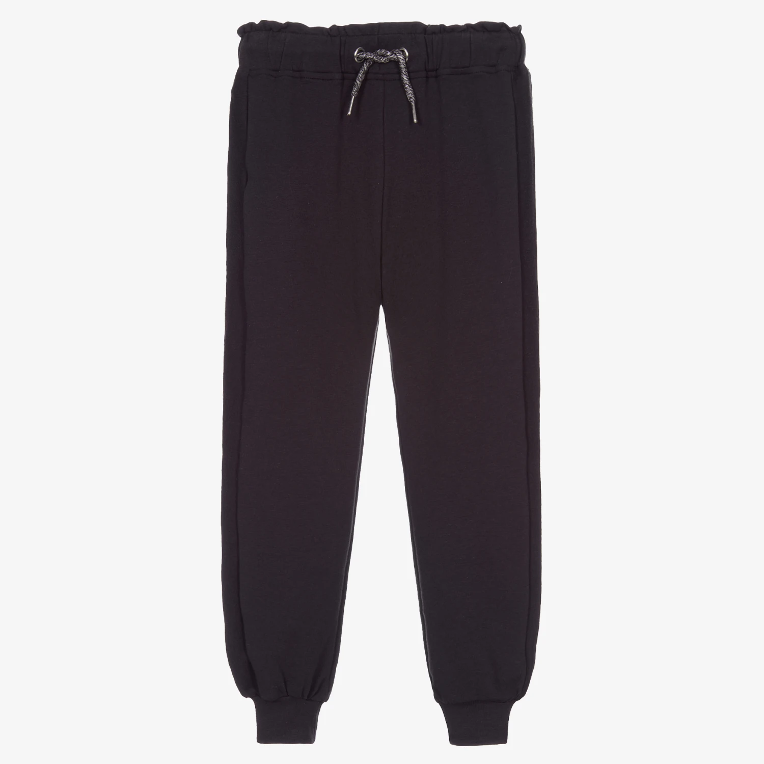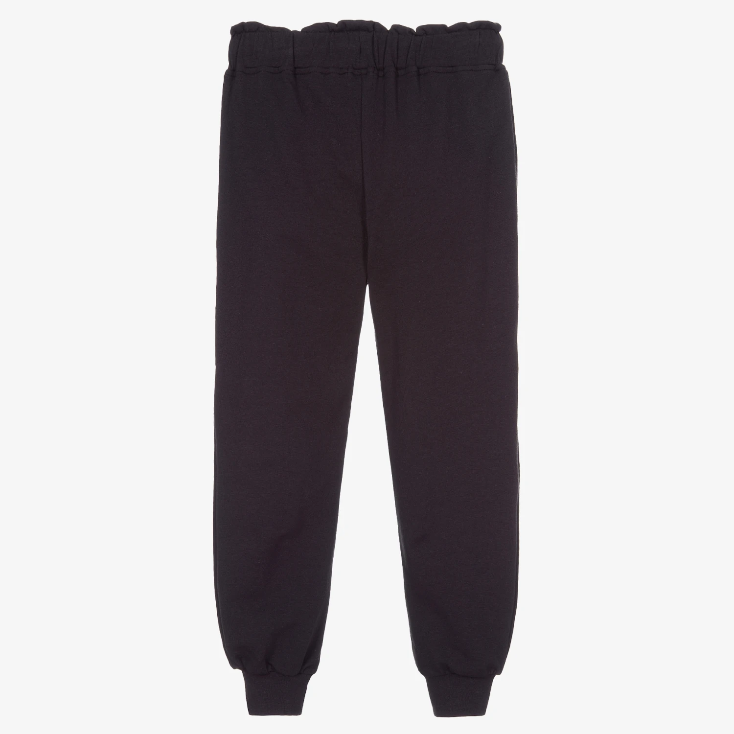 Charcoal grey joggers for girls by Mayoral. Made in comfortable cotton-blend jersey, the waistband is frilled and elasticated with a useful drawstring for a good fit. There are contrasting dark grey bands along the outside of the legs.