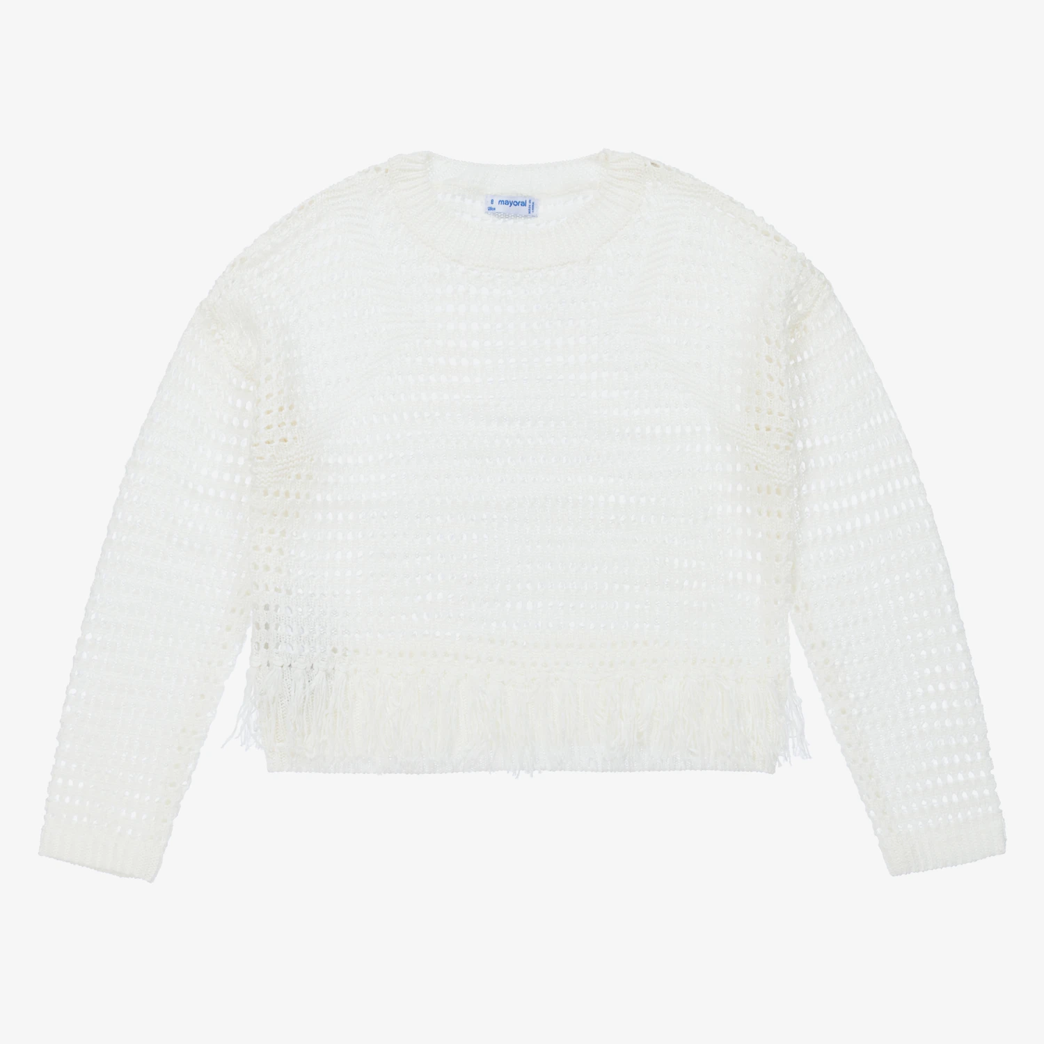 An ivory sweater for girls by Mayoral. A great layering piece, this soft jumper is made in open-work crochet, with fringing along the hemline for a cool boho look.
