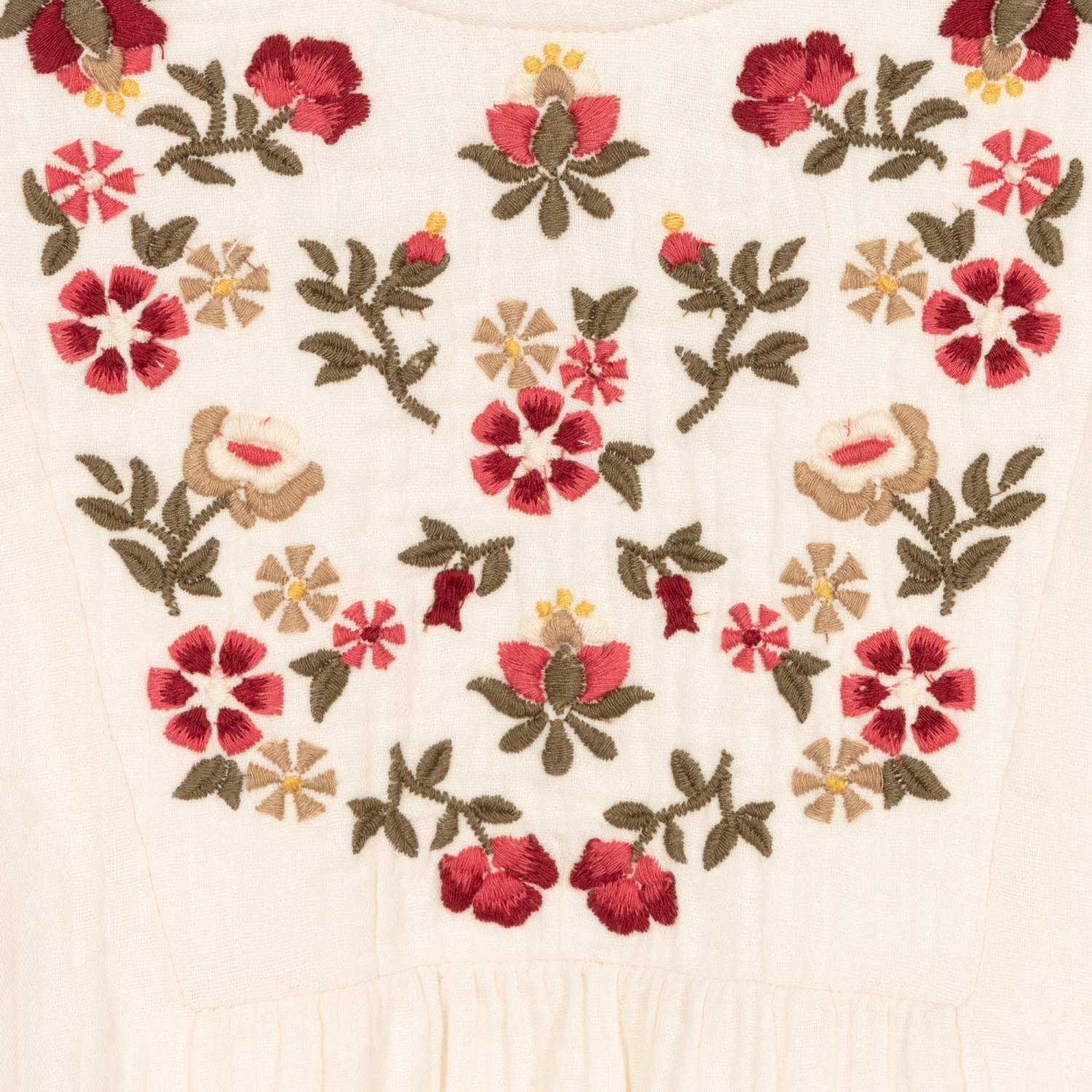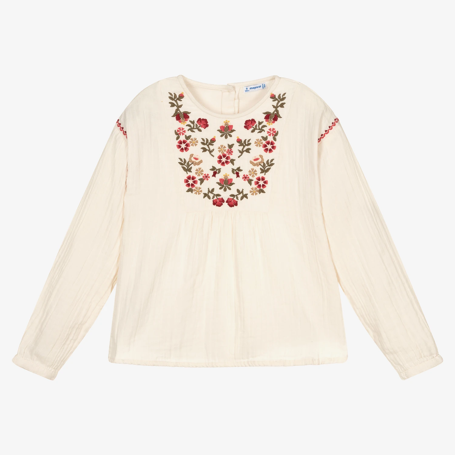 Ivory blouse for girls by Mayoral, with beautiful pink and green floral embroidery. Made in lightweight cotton cheesecloth, it is slightly gathered below the bib and has pink geometric embroidery around the top of the sleeves. It fastens with buttons on the back and cuffs.