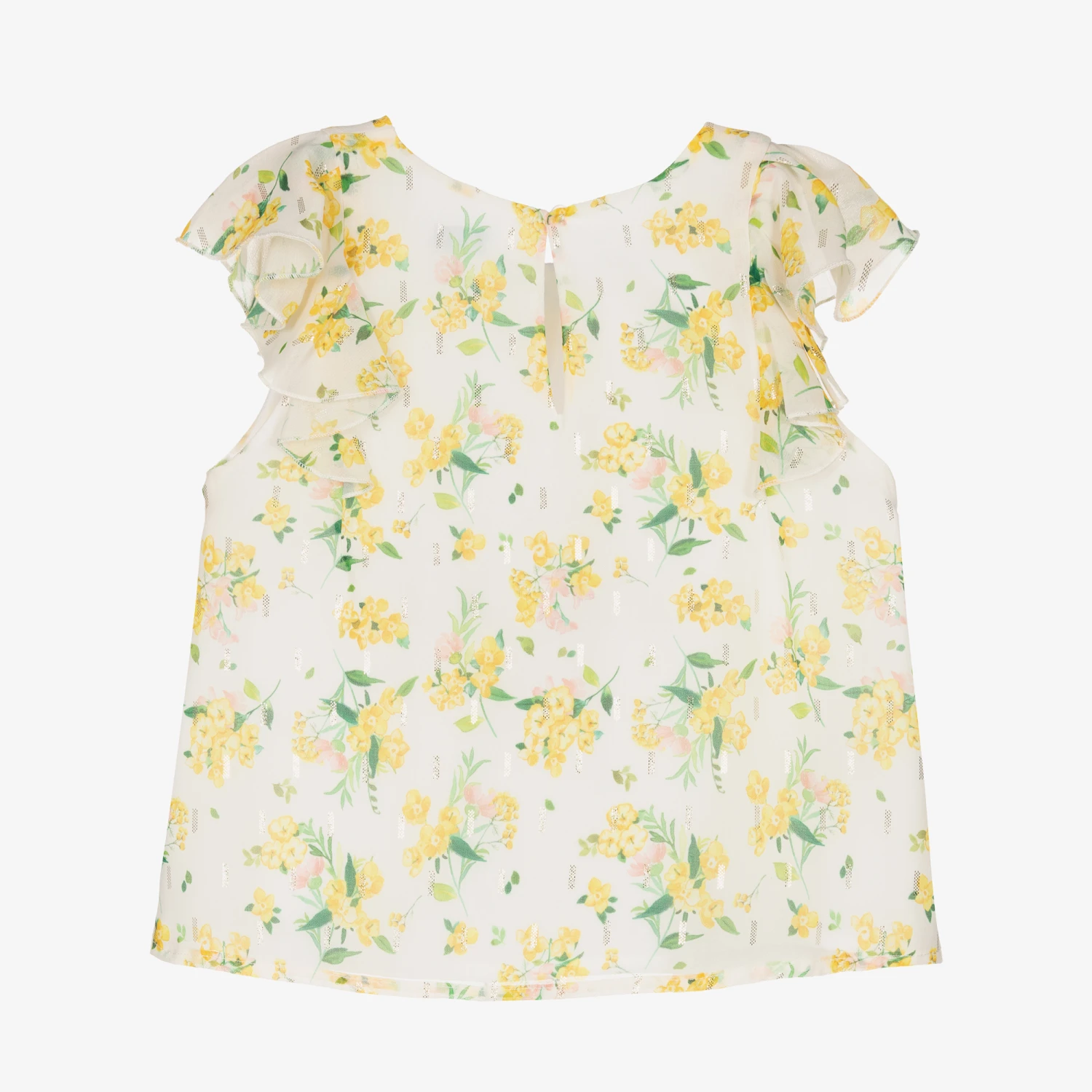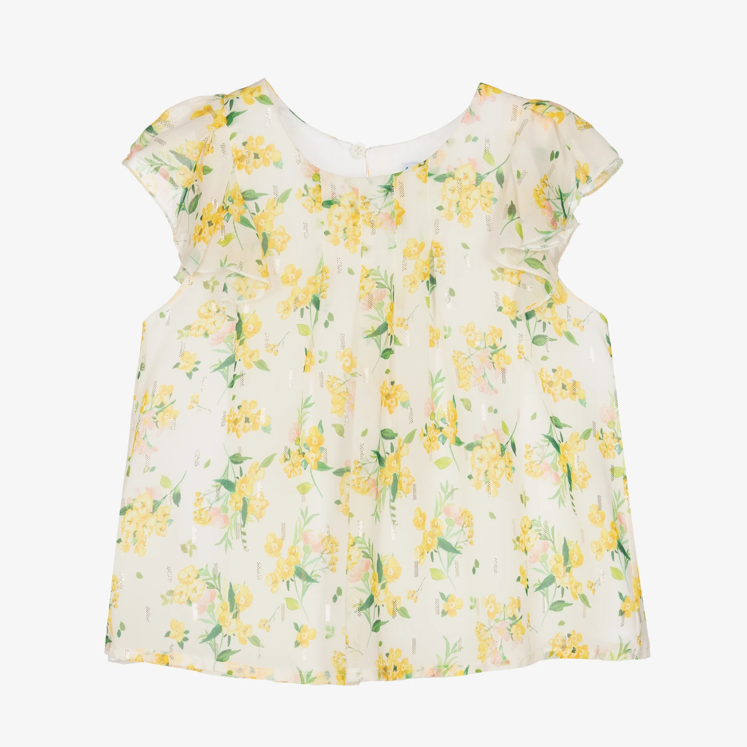 Girls lovely ivory crรชpe chiffon blouse by Mayoral, in a yellow, pink and green floral print with a subtle gold pattern for a little sparkle. Sheer and lightweight, it has soft pleated detail on the front and pretty ruffles over both shoulders. It is fully lined for comfort and there is a button fastening on the back for ease of dressing.