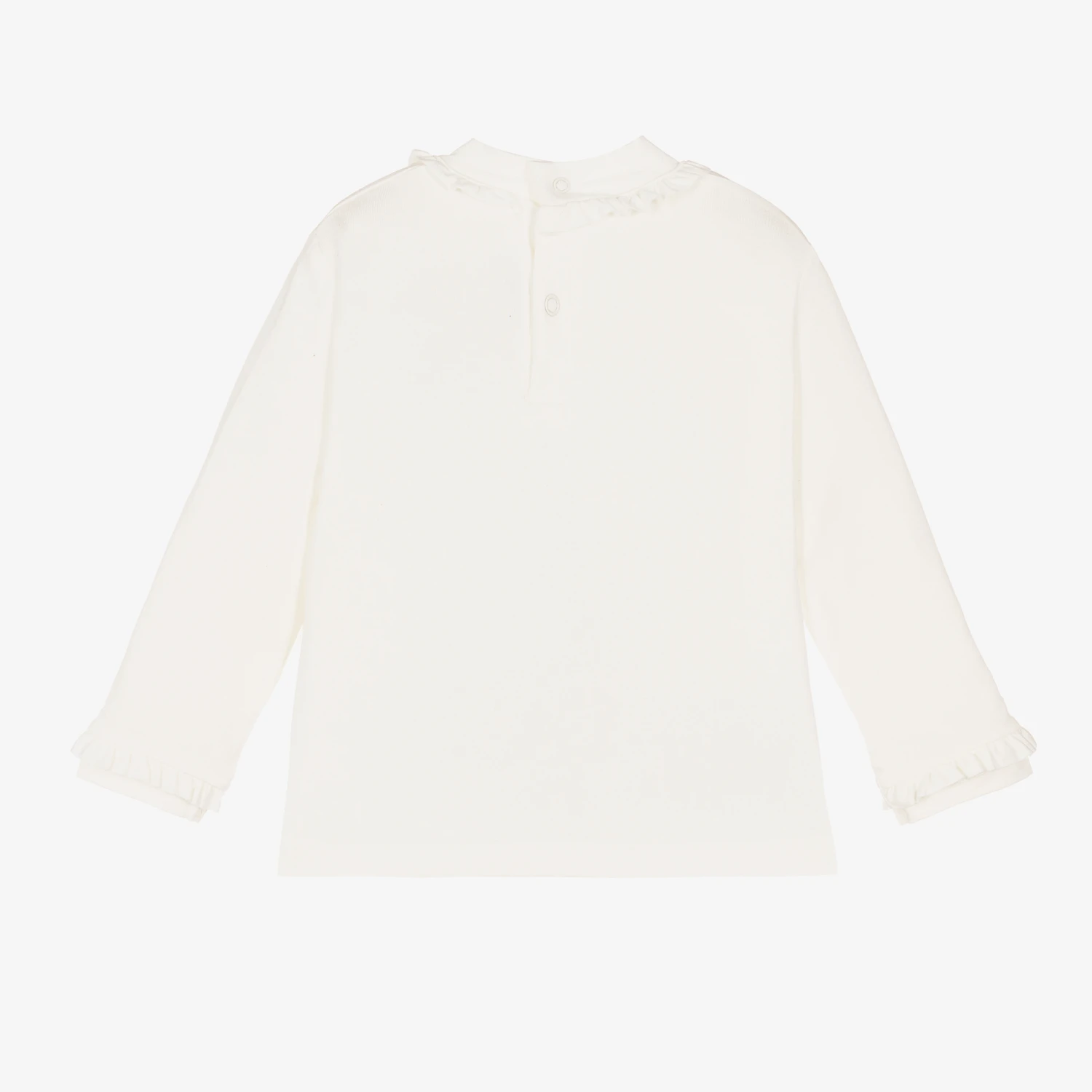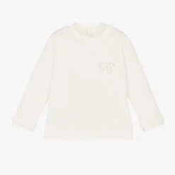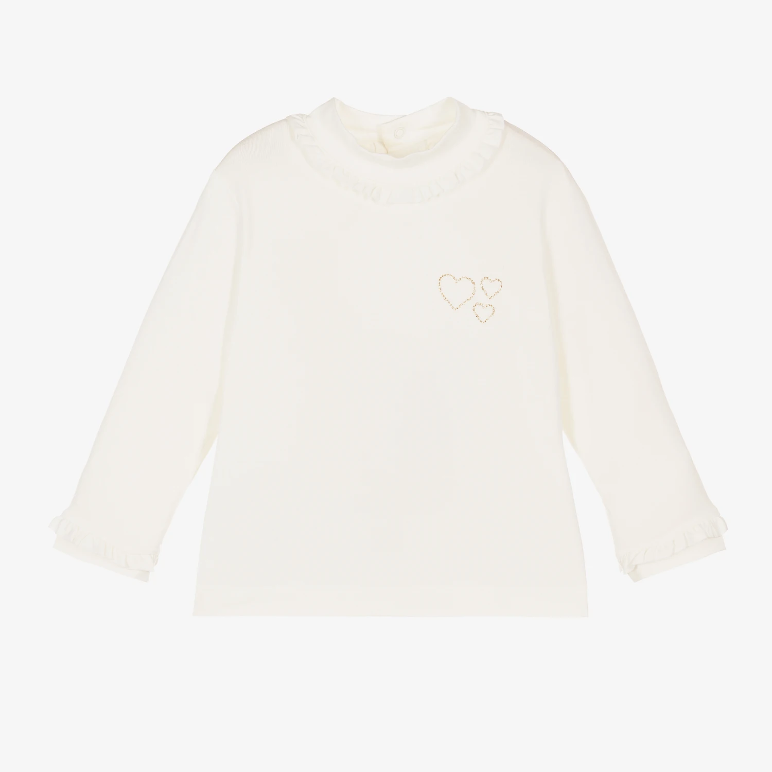 Ivory turtleneck top for little girls by Mayoral, made in soft viscose jersey. The neck and cuffs have sweet ruffle trims and there is a glittery gold heart print on the chest. It fastens easily with poppers on the back.