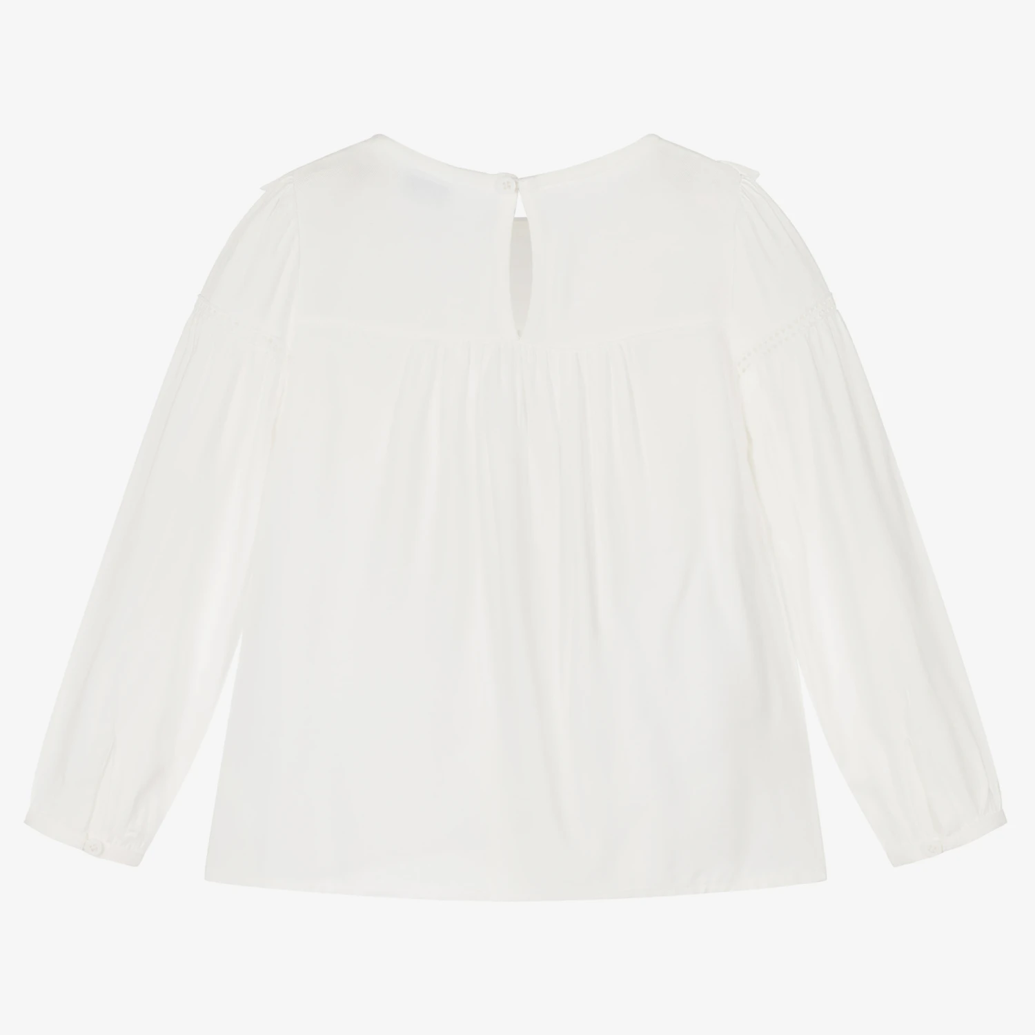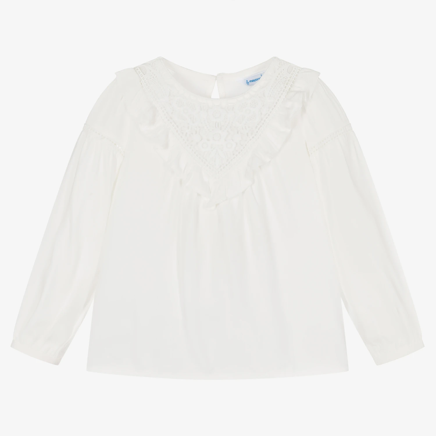 Pretty ivory blouse for girls by Mayoral, made in soft and lightweight viscose twill. It has a V-shaped floral lace insert with ruffle trim and delicate ladder lace on the puffed sleeves. This lovely feminine style fastens with a single button on the back.
