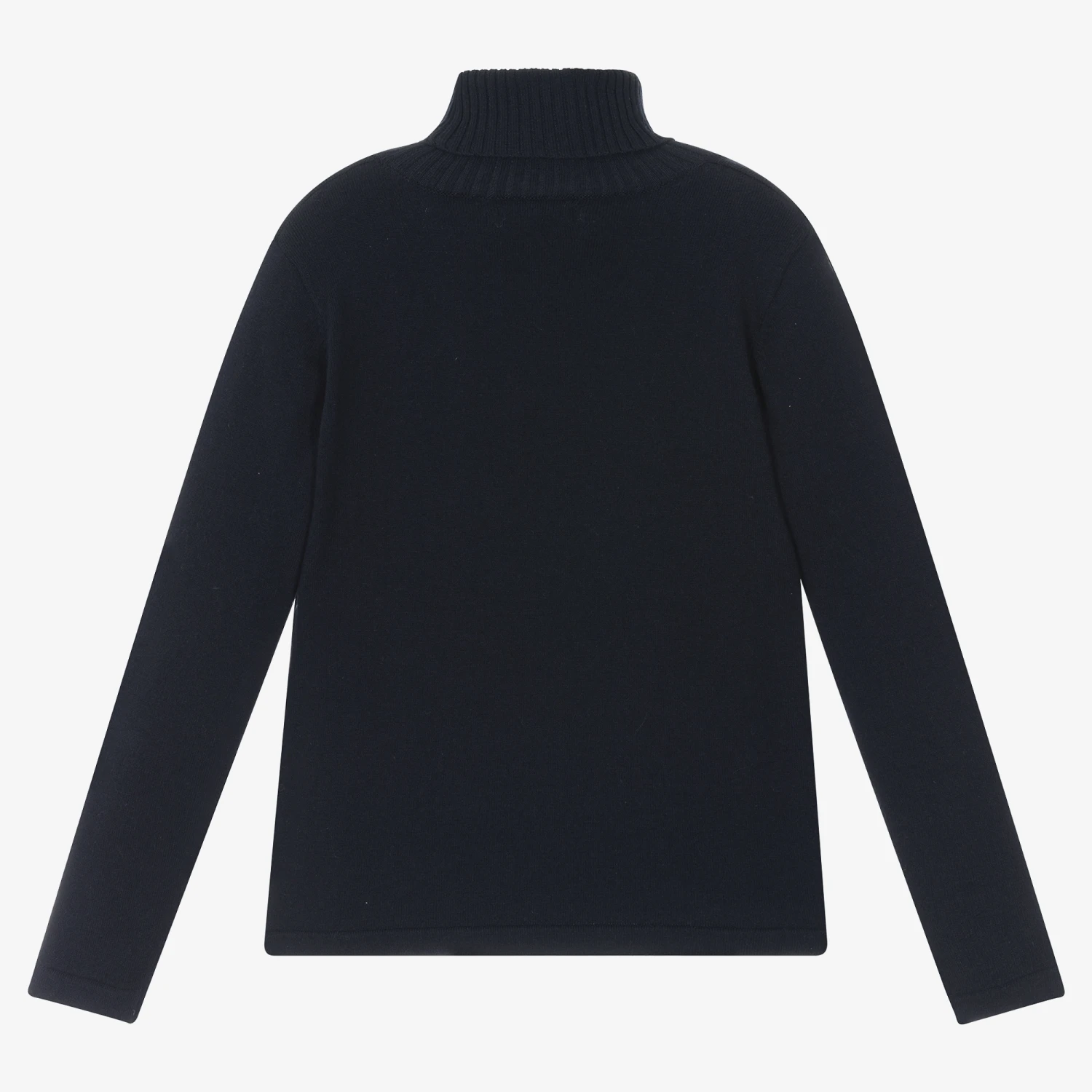Navy blue roll neck top for girls by Mayoral, knitted in a soft cotton blend. It has ribbed trims and has the brand’s silver logo tab by the hemline. This garment contains sustainable cotton.