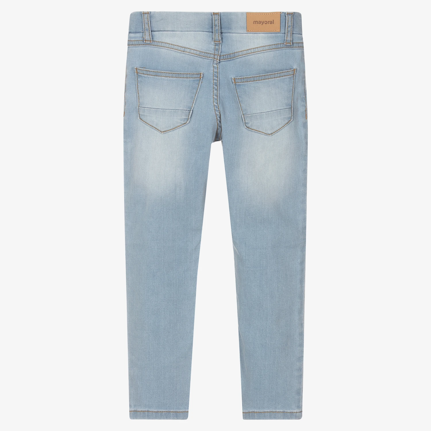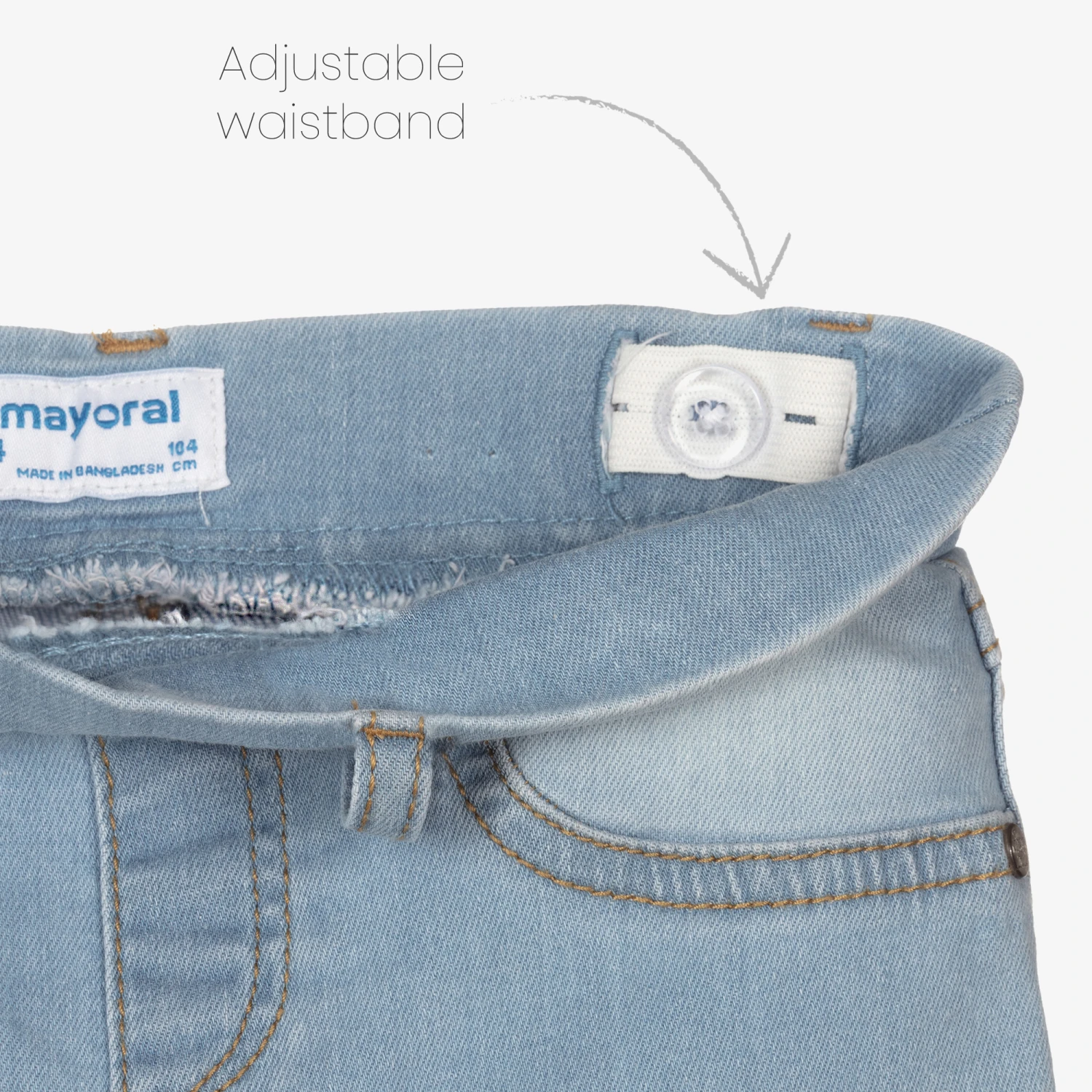 Girls pale blue jeggings by Mayoral, made in stretchy cotton denim with a washed and worn look. In a super skinny fit, they have an adjustable waistband and faux front pockets. There are patch pockets on back, together with the brand’s beige faux leather logo patch.