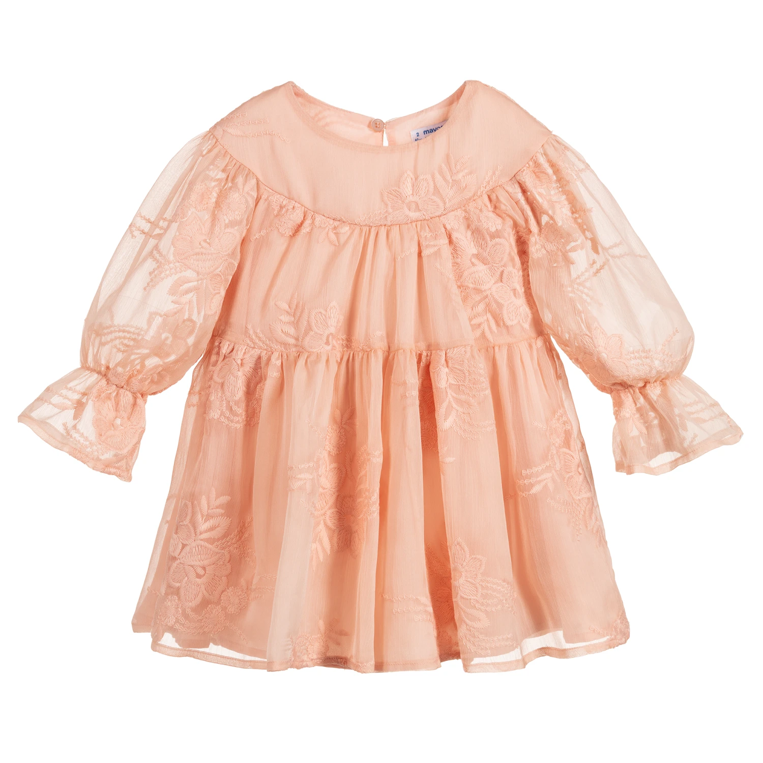 A pretty pink chiffon dress by Mayoral, with delicate floral embroidery. It has a soft polycotton lining and it fastens with buttons on the back.