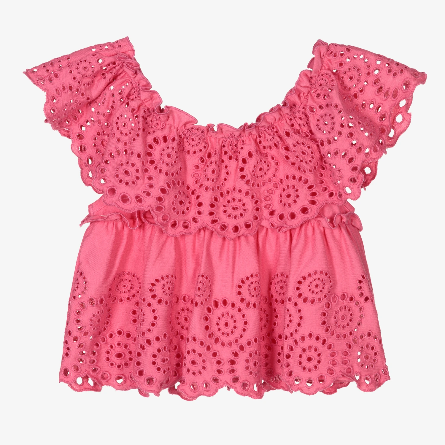 Deep pink blouse for girls by Mayoral, made in soft cotton jersey. Fully lined, it has cool all-over broderie anglaise detailing and a gathered neckline.