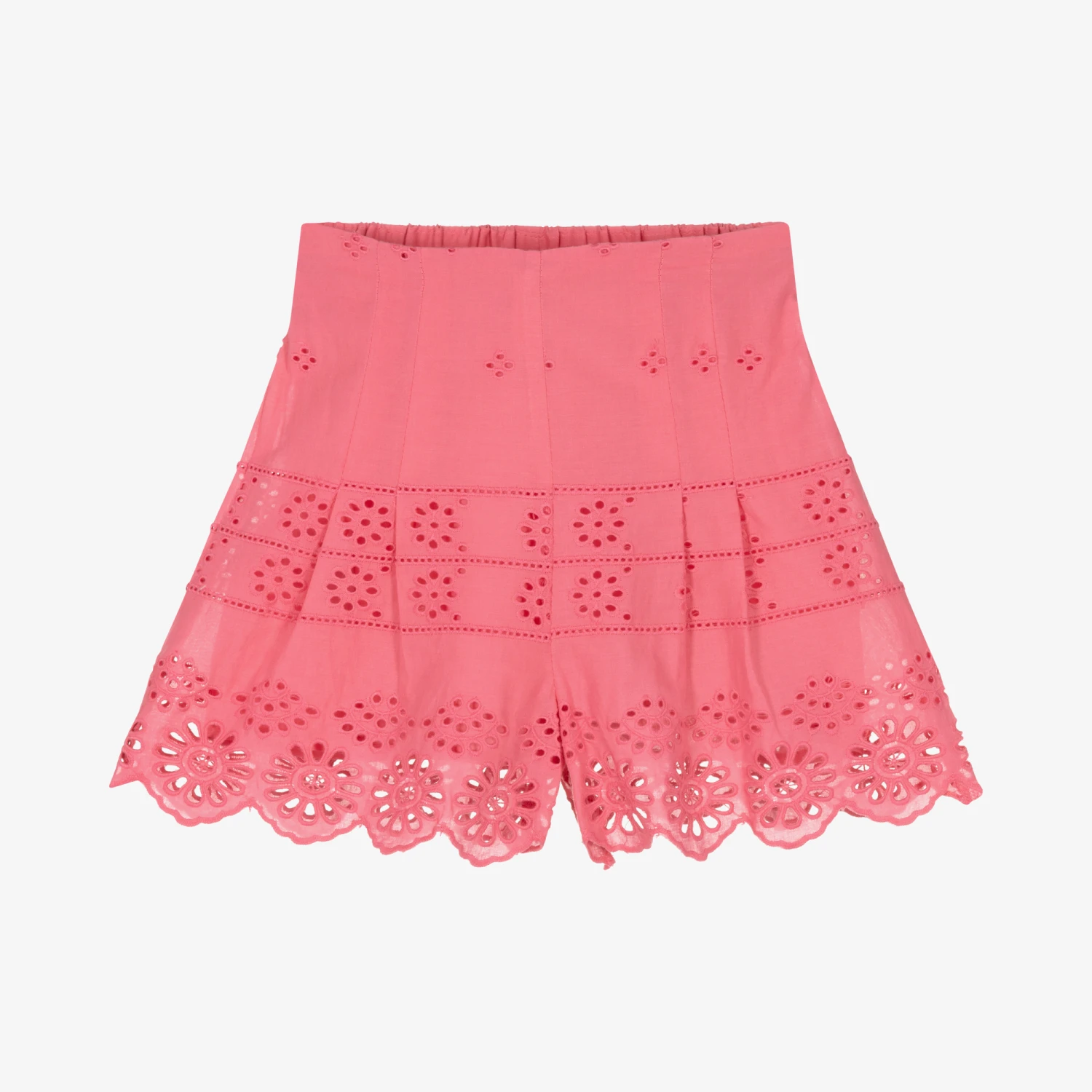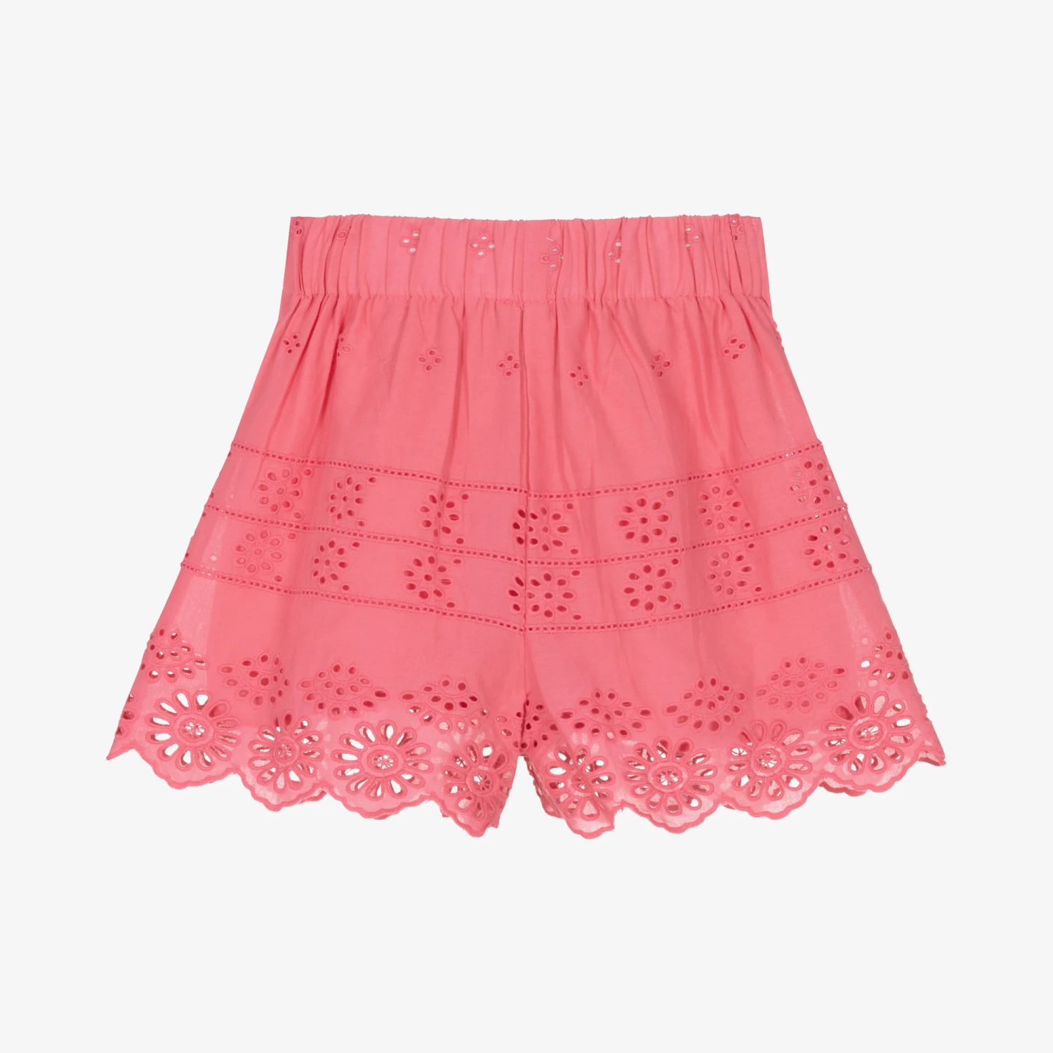Pretty pink cotton shorts for girls by Mayoral, with lovely broderie anglaise detailing. Soft and lightweight, this easy-to-wear style is fully lined for comfort and the waist is gently elasticated around the back for easy pull-on.