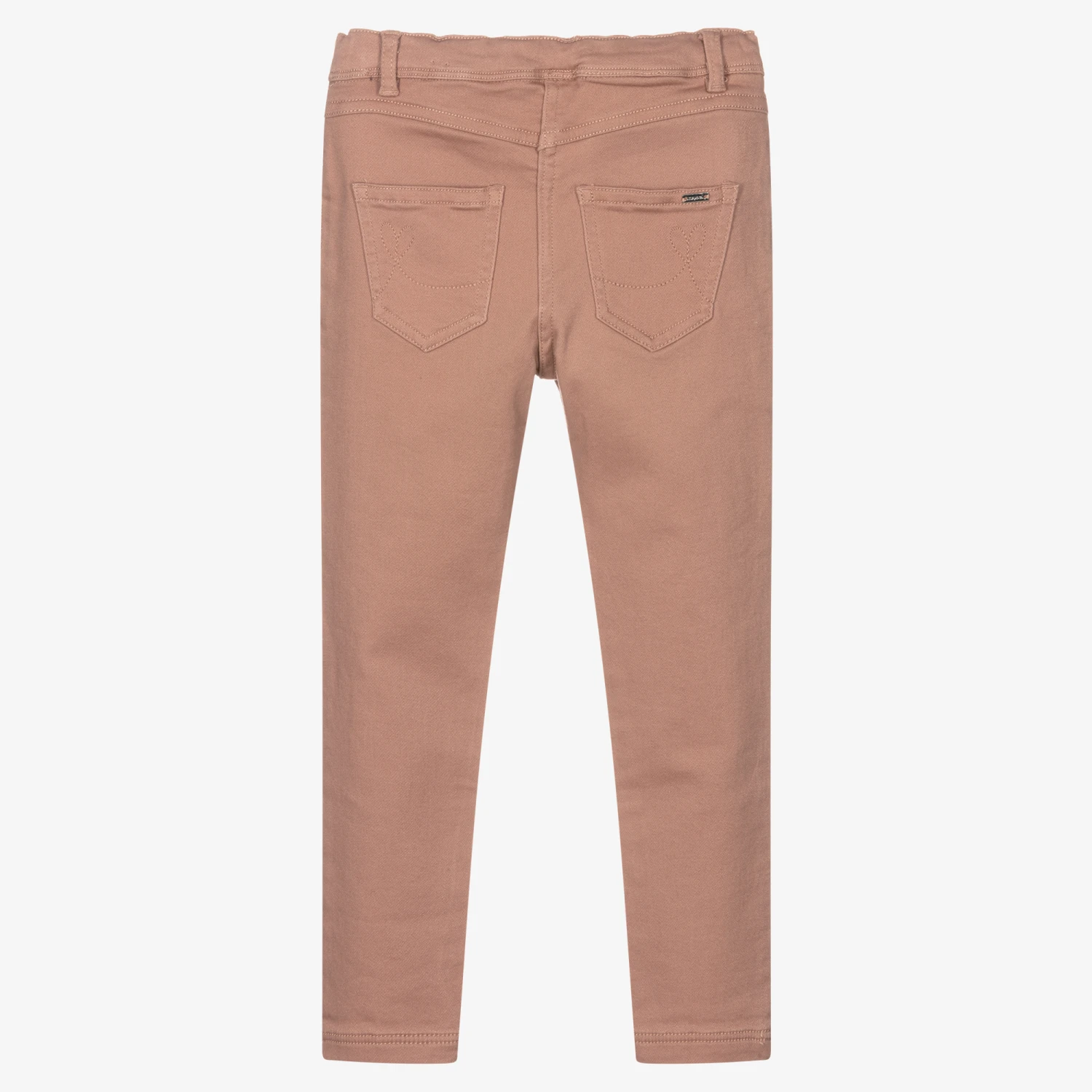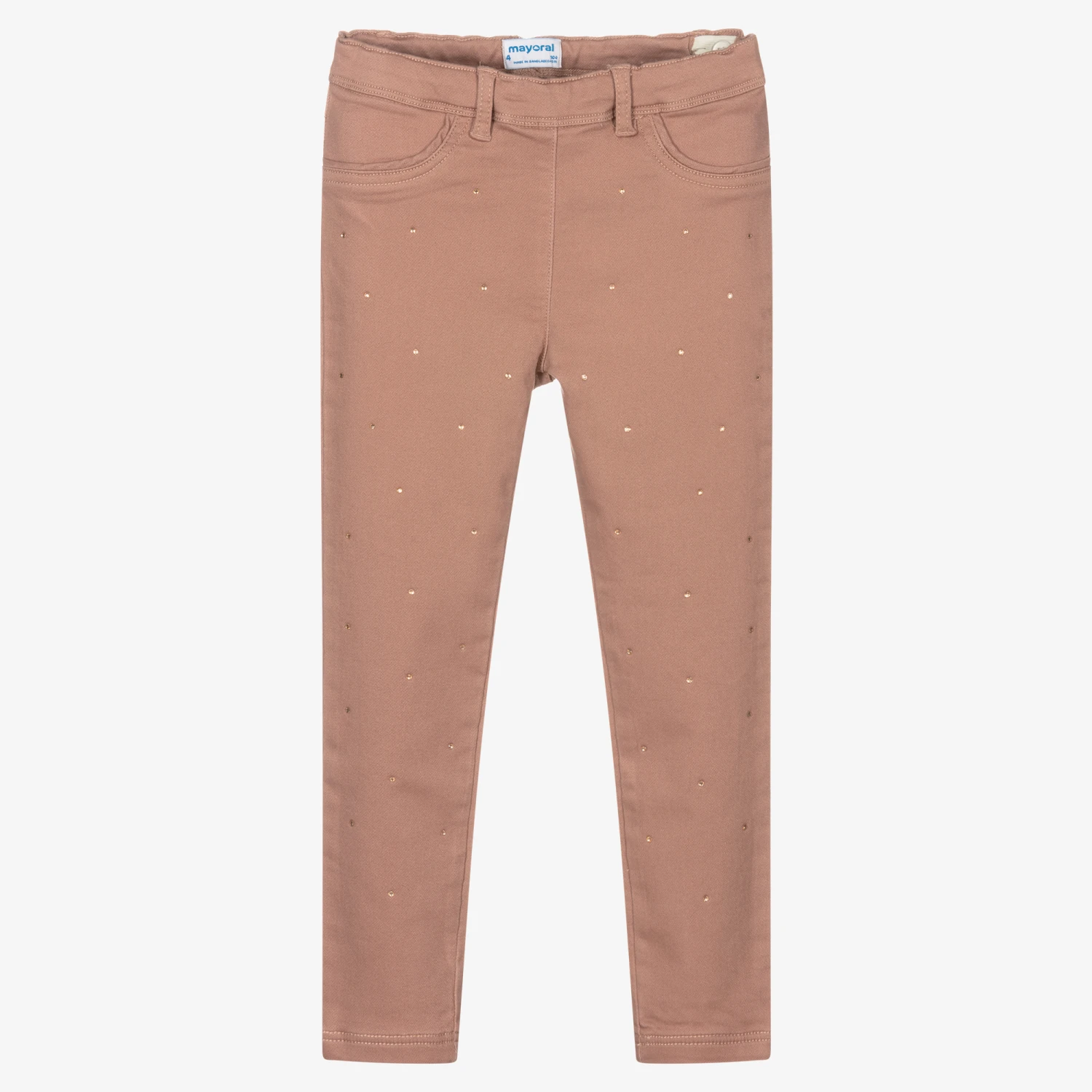 Dusky pink jeggings for girls by Mayoral, made in soft and stretchy cotton twill. Trimmed with eye-catching pink diamantés on the front, they have faux front pockets. There are pockets on the back with a silver metal logo trim and they have a useful adjustable waistband