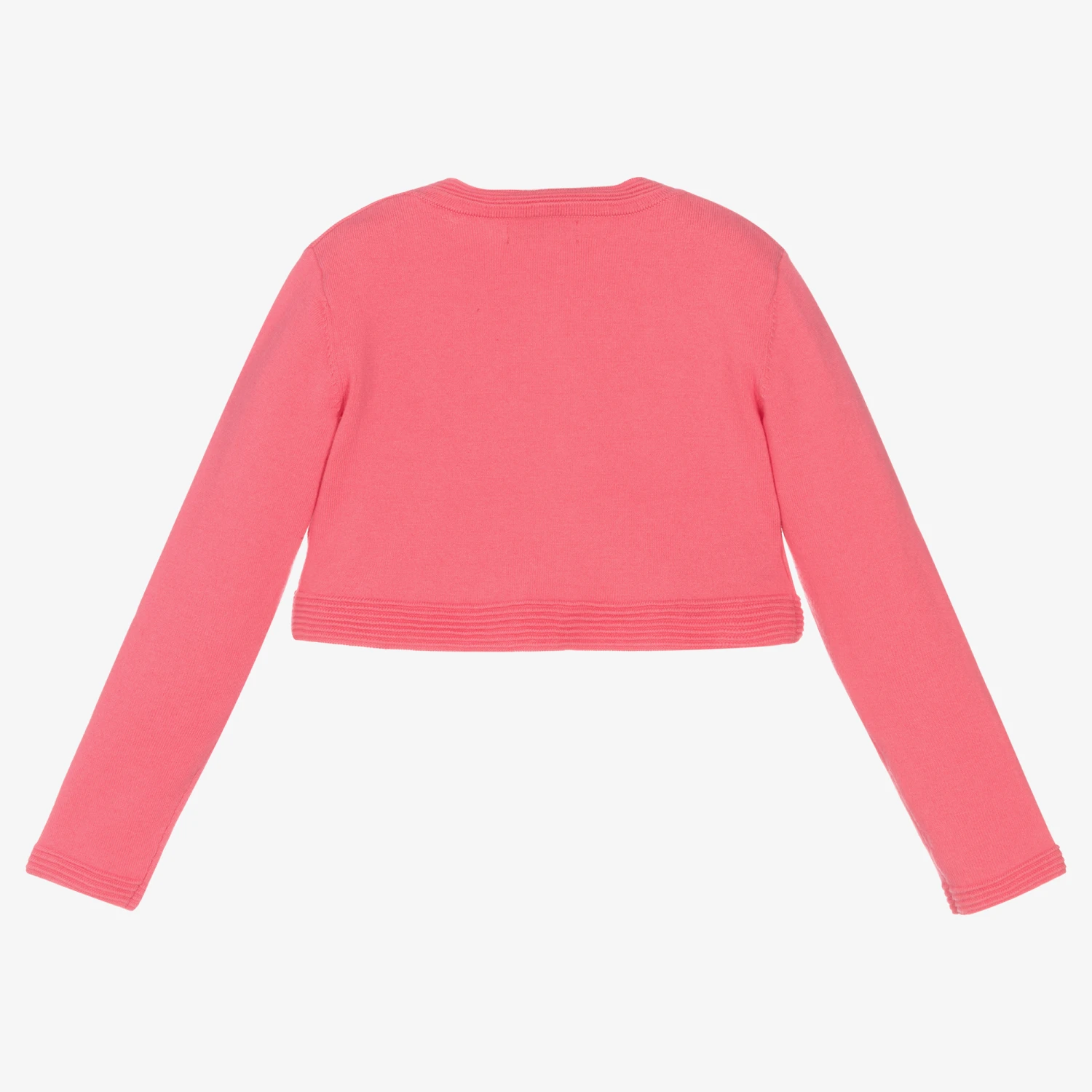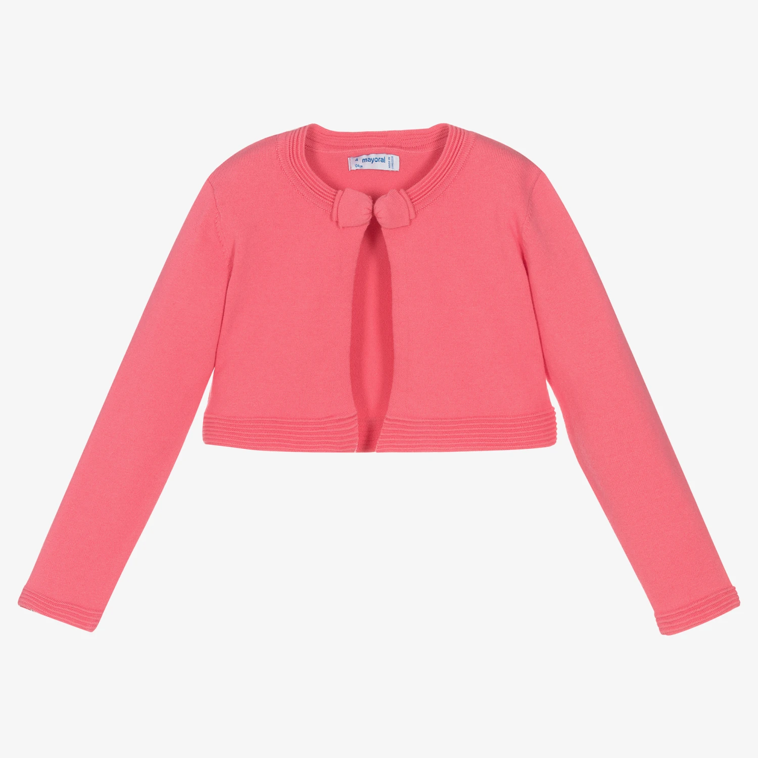A lovely pink shrug cardigan for girls by Mayoral, finely knitted in a soft sustainable cotton blend. Ideal for lightweight warmth, it secures with a single button at the neck and is trimmed with an elegant little bow.