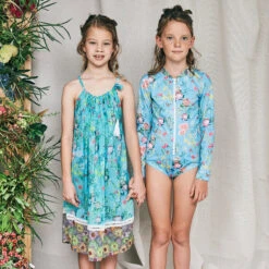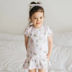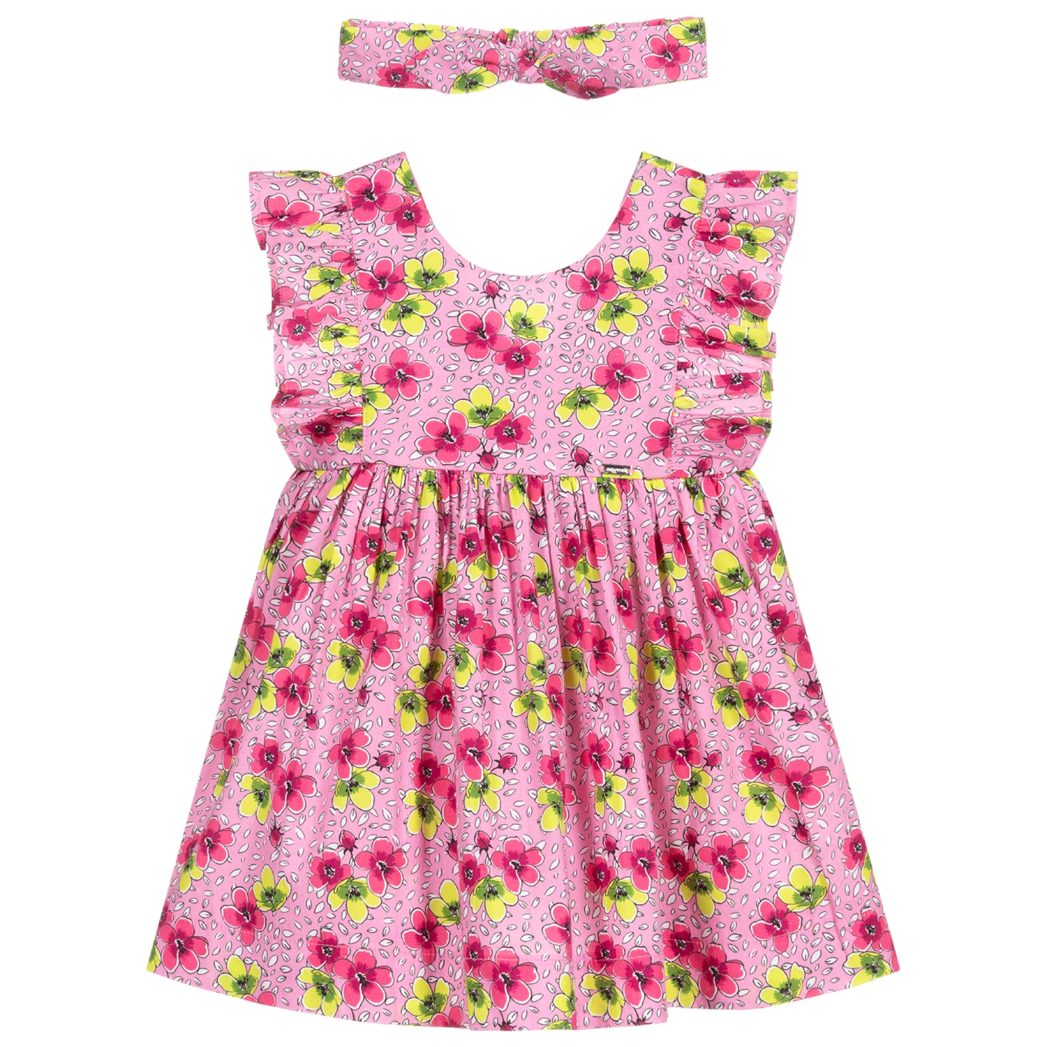 Pretty pink pinafore dress for younger girls by Mayoral, with a pink and green floral print. Made in lightweight cotton, it has frills over the shoulders and a gathered skirt. It comes with a matching headband that is secured with an elasticated band around the back.