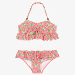 Girls lovely pink bikini by Mayoral, with green palm tree and geometric shape patterns. The top is lined and has a lovely bow on the front, wooden beads on the adjustable halterneck strap and a sweet ruched panel on the back. Silky smooth and stretchy, both pieces have matching ruffle trims for a sweet finishing touch.
