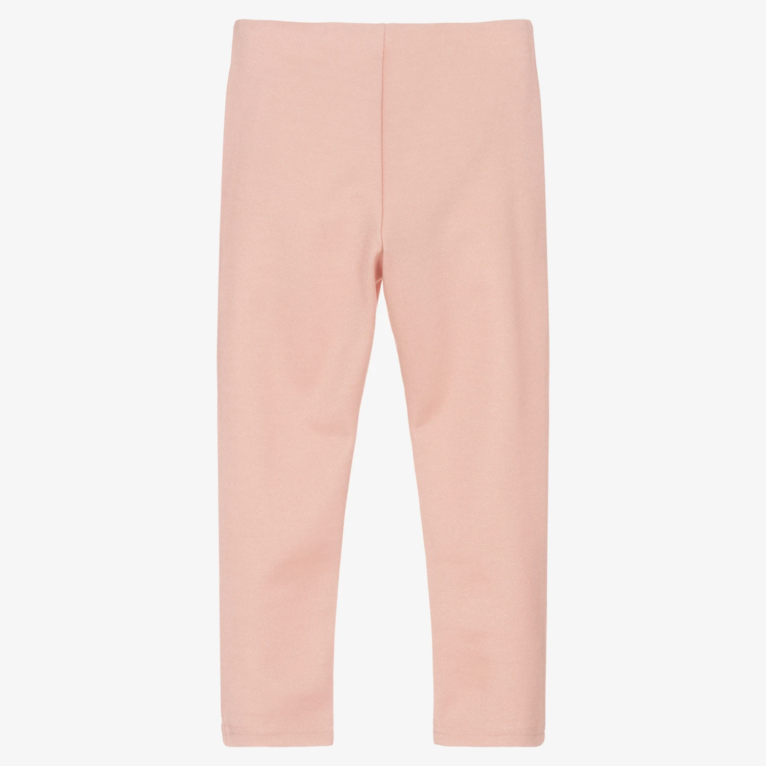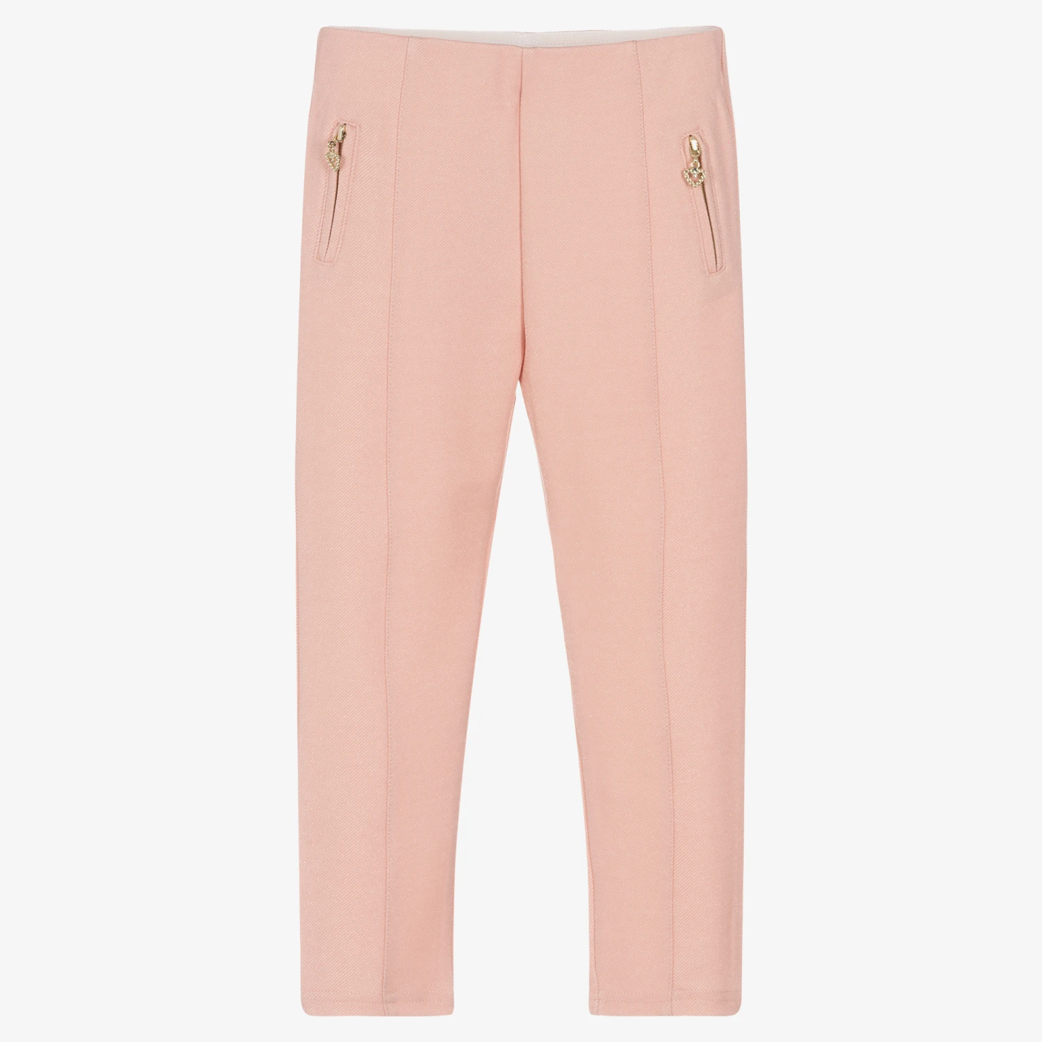 Shimmery pink trousers for girls from Mayoral. In a stylish slim fit, they are made in soft and stretchy twill, woven with a glittery thread. They have a comfortable elasticated waist for quick and easy dressing and faux gold zipped pockets with diamanté heart-shaped pulls