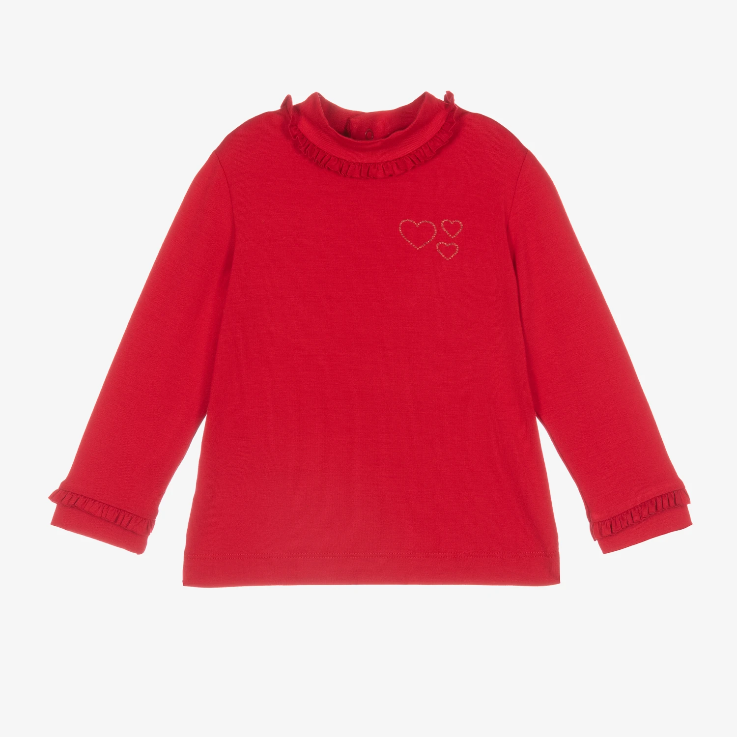 Red turtleneck top for little girls by Mayoral, made in soft viscose jersey. The neck and cuffs have sweet ruffle trims and there is a glittery red heart print on the chest. It fastens easily with poppers on the back.