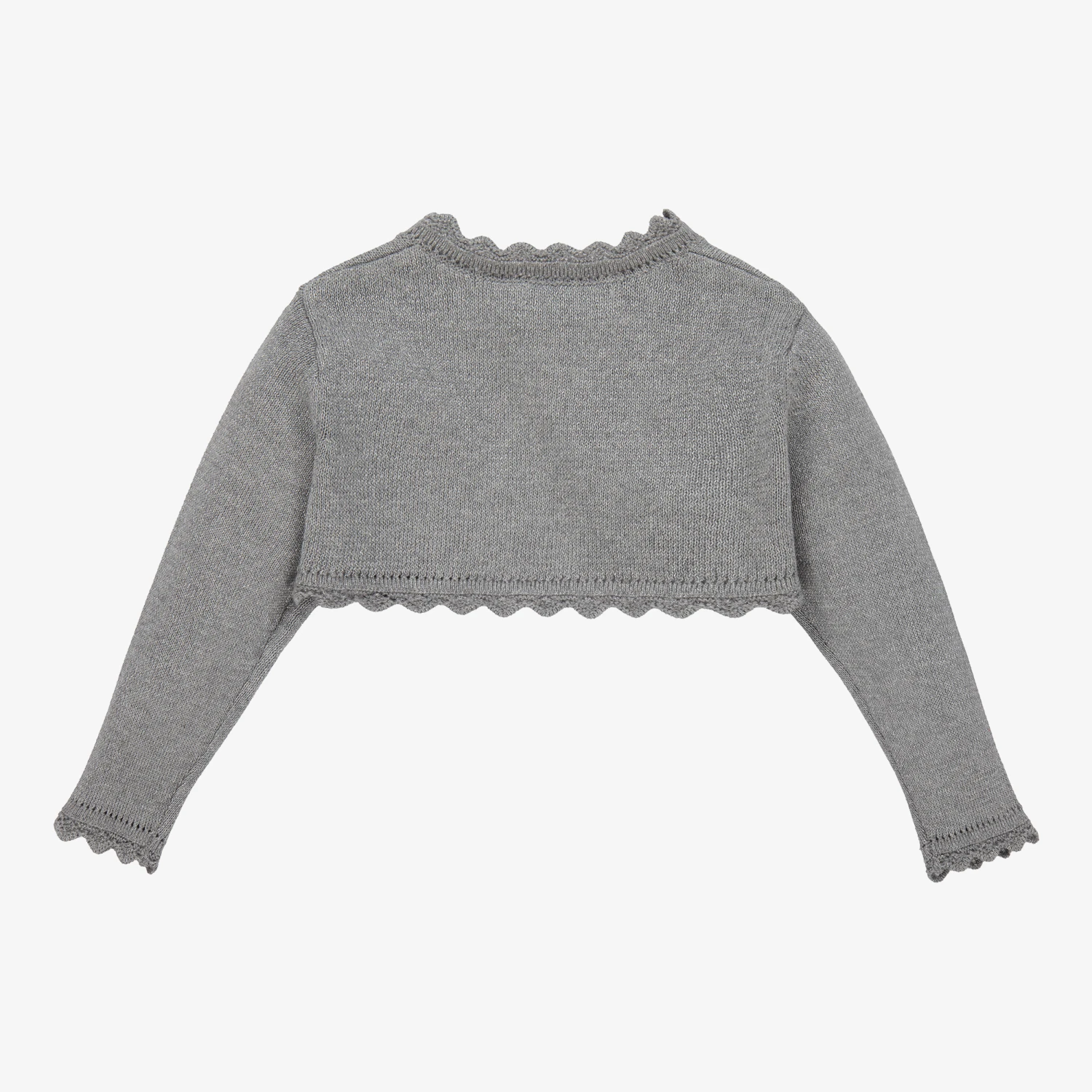 A sparkly silver bolero cardigan for little girls by Mayoral. It is knitted in sustainable cotton, with a metallic thread in the yarn. It has pretty scalloped trims and fastens with a single button at the neck.