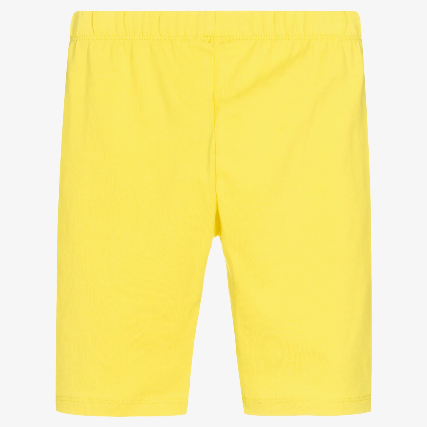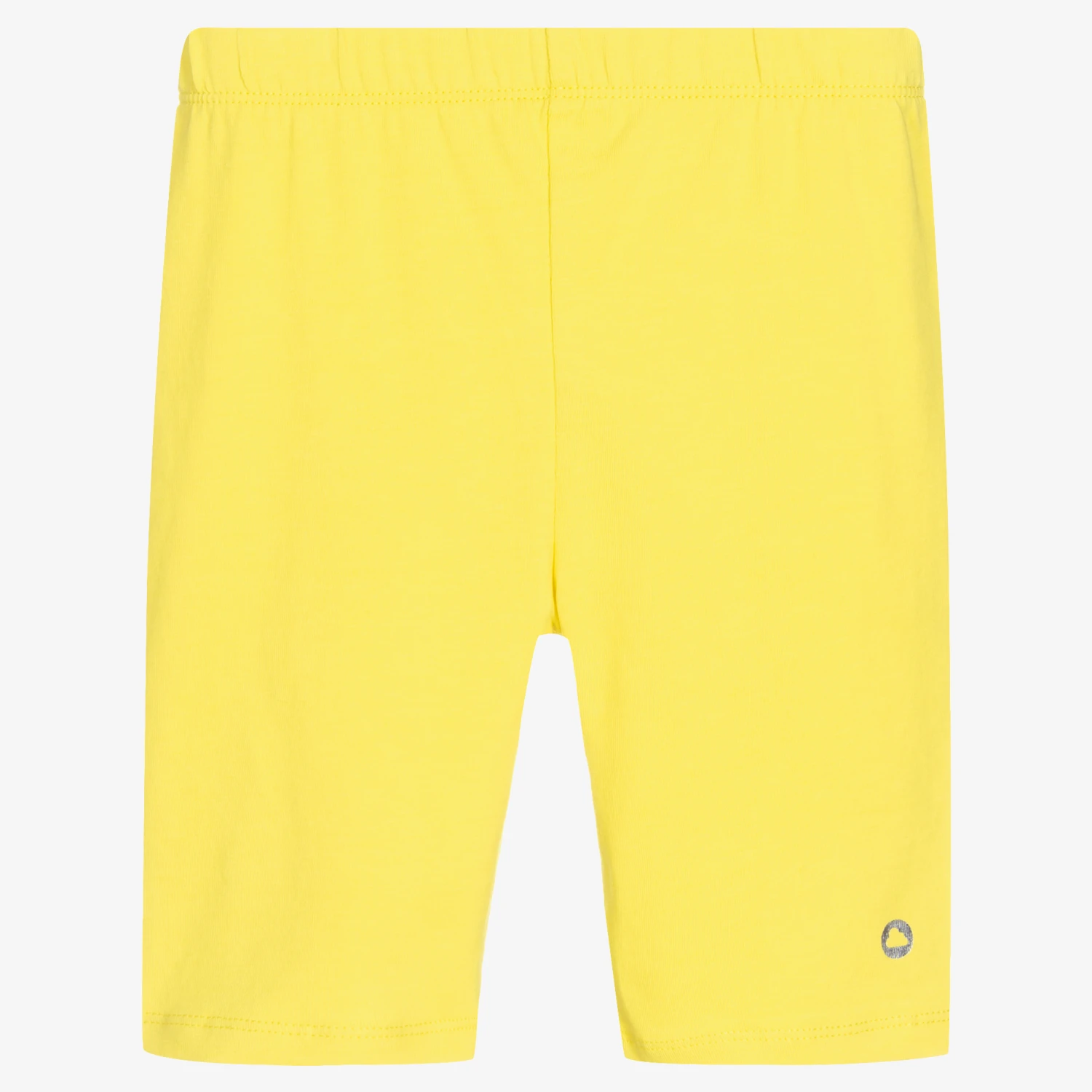 Bright yellow cycling shorts for girls, by Mayoral. Made in soft sustainable cotton jersey, they have a silver logo print on one leg, and an elasticated waist for a comfortable fit.