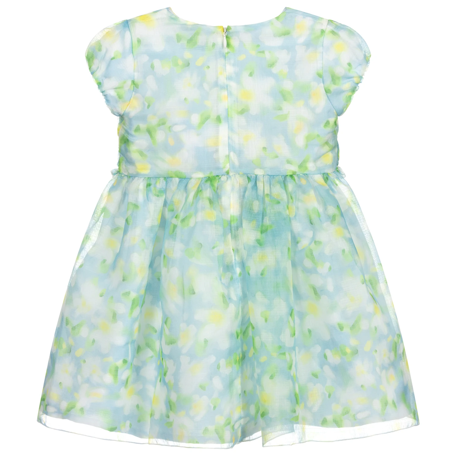 Designed for girls by Mayoral, a beautiful blue and green organza dress, with a lightweight polycotton lining. Lovely for a special occasion, it has lightly puffed sleeves and gorgeous ruffles on the bodice. It has a concealed zip fastening on the back for easy dressing.