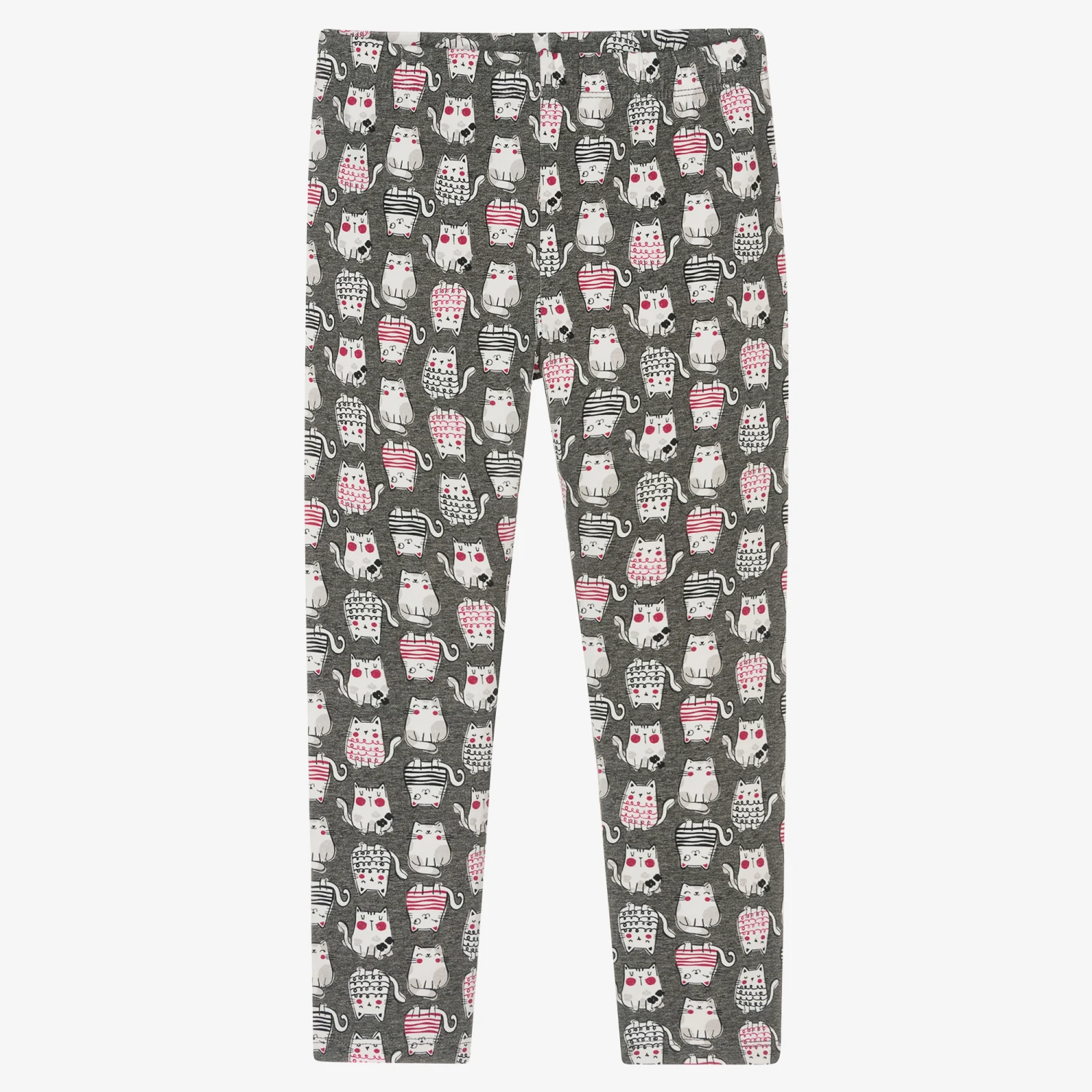 Dark grey sustainable cotton leggings for girls by Mayoral, made with soft and stretchy jersey. These comfortable bottoms have an elasticated waist and a cute little cat pattern in deep pink and ivory.