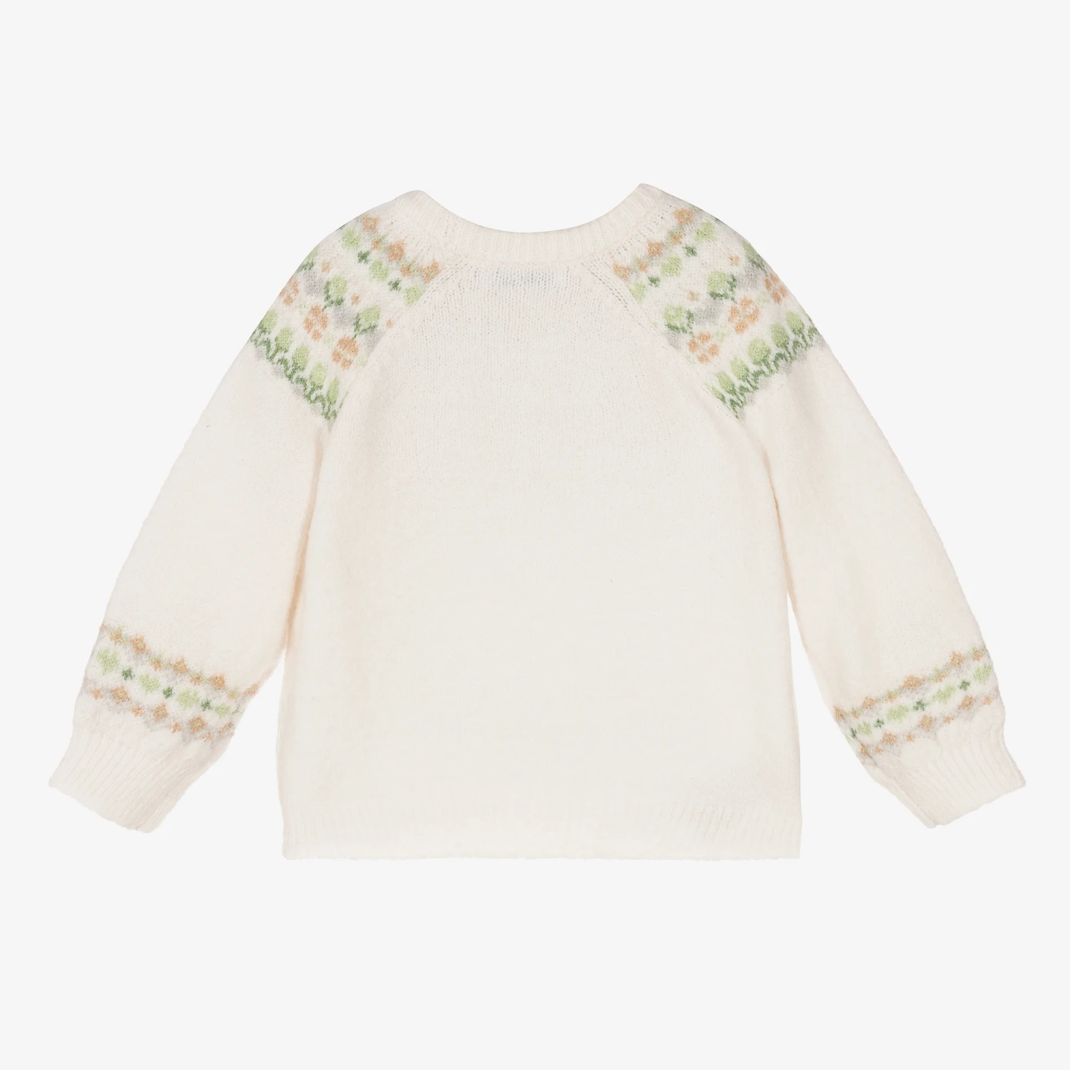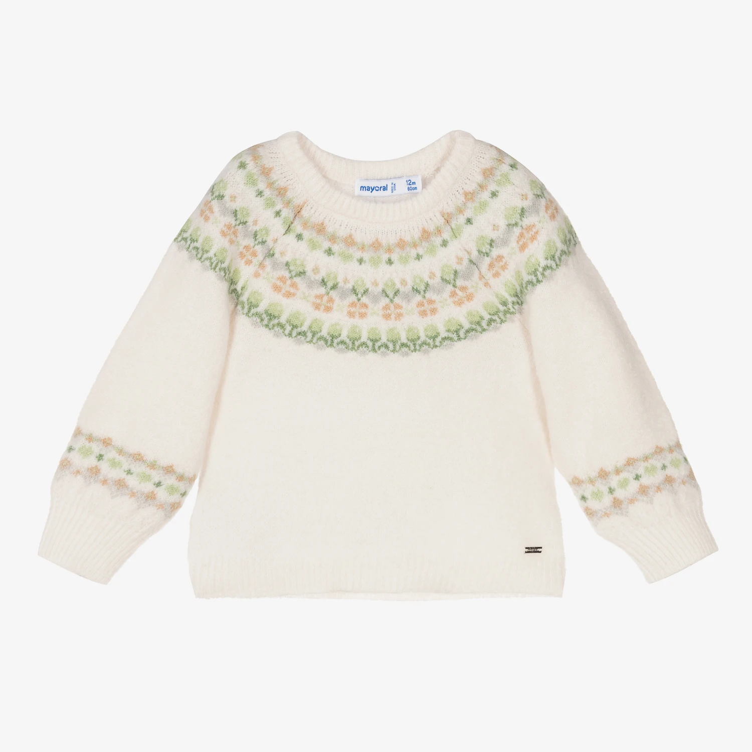 Ivory sweater for girls and boys by Mayoral, knitted in a soft recycled polyester and acrylic blend. It has a sweet Fair Isle design in brown, green and grey.