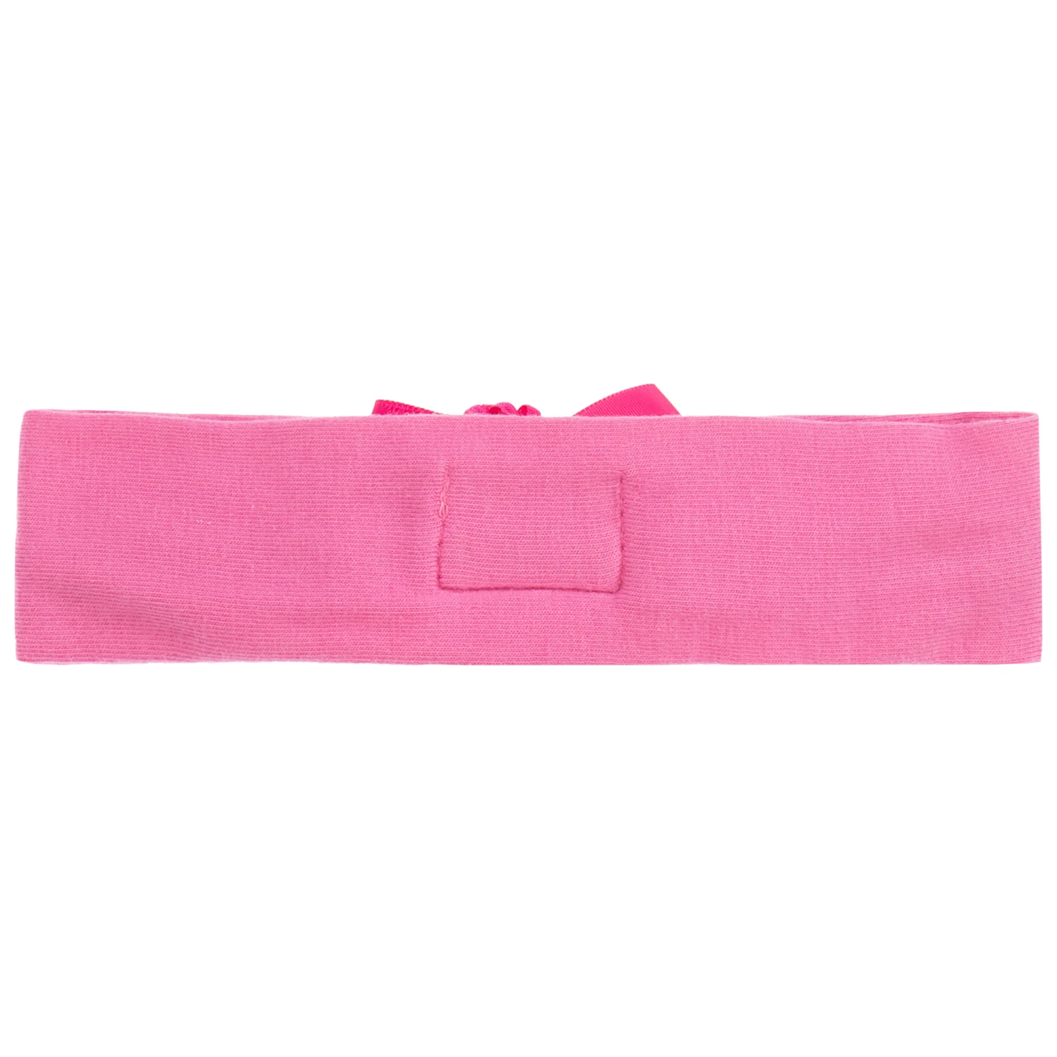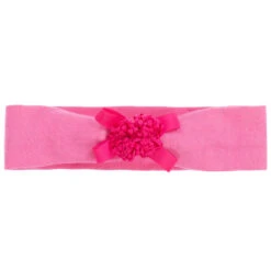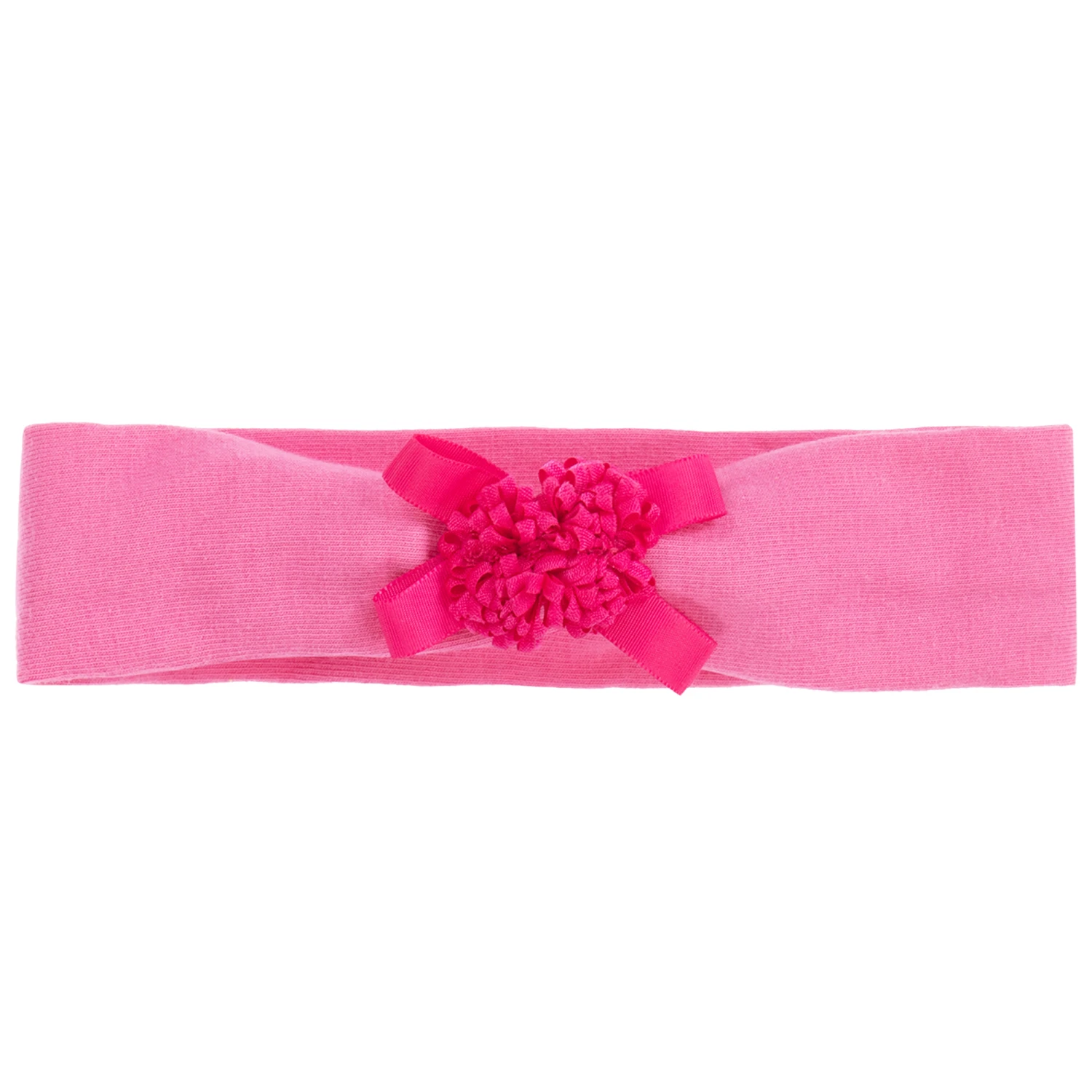 Baby girls fuchsia pink headband by Mayoral Newborn. It is made in a soft and stretchy cotton jersey, with ribbon work flowers and a bow.