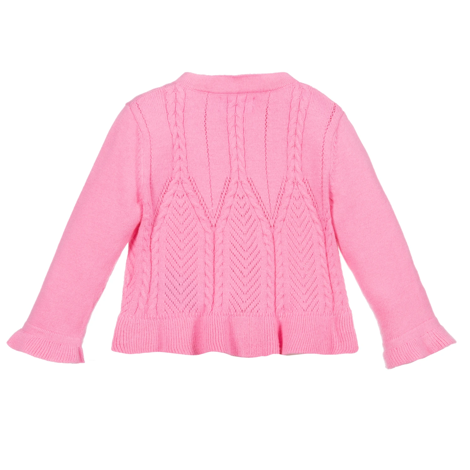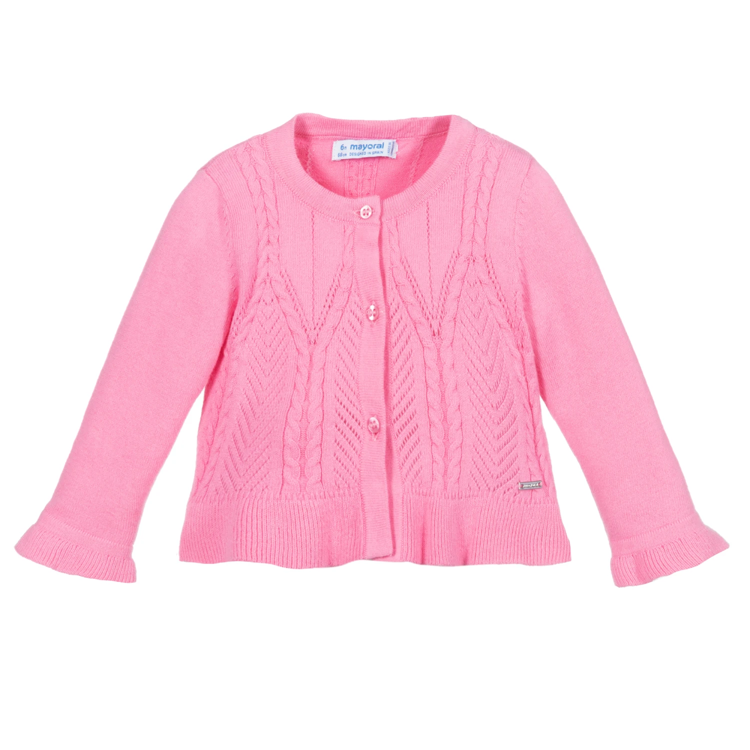 A pretty pink cardigan for little girls by Mayoral. Made from soft and lightweight sustainable cotton, it has a lacy cable pattern in the knit. The hem and sleeves are ruffled and there is a tiny gold metal logo tab on the front.