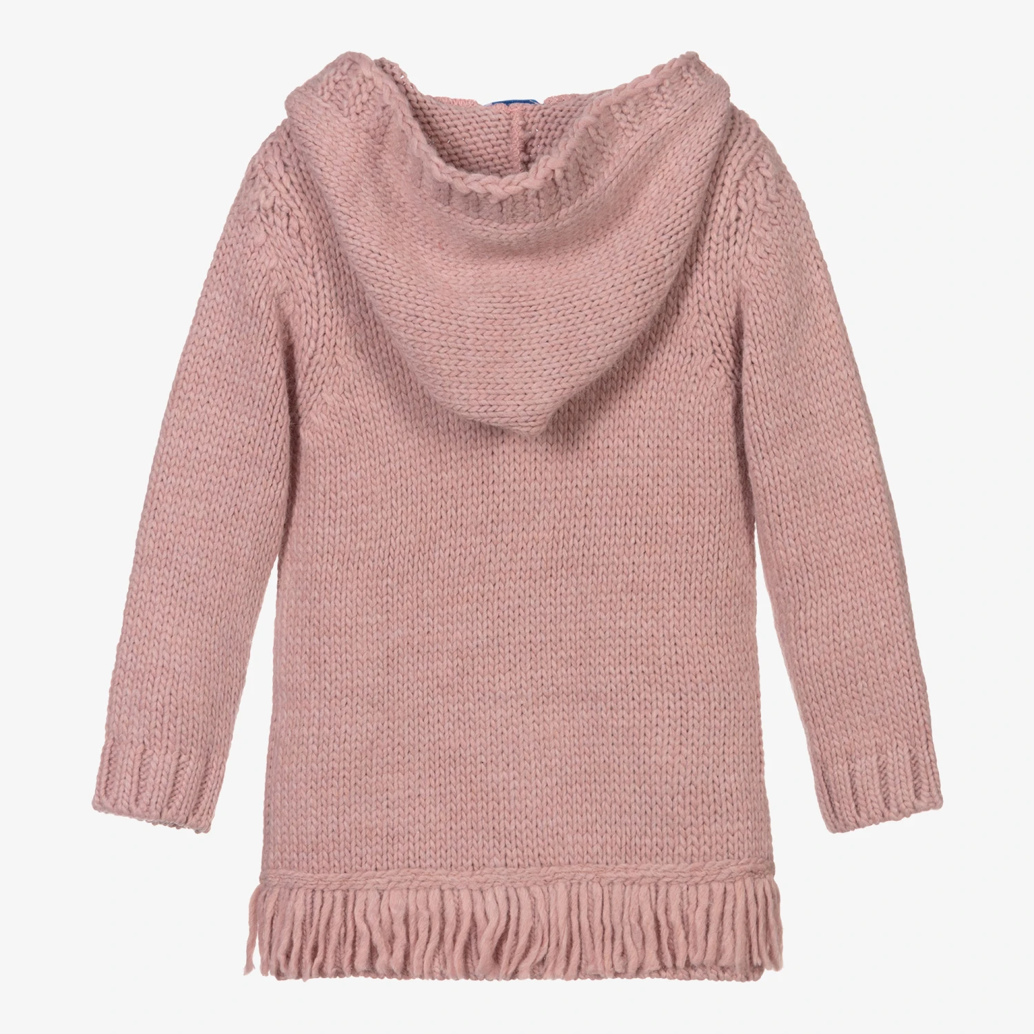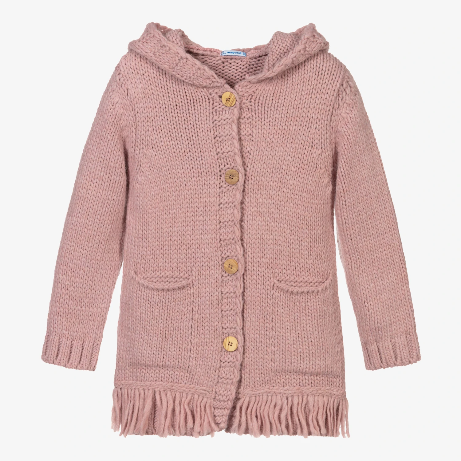 Dusky pink hooded cardigan for girls by Mayoral, knitted in a soft chunky blend of wool, alpaca and viscose. In a longer length, it has fringing on the hem, front pockets and wooden buttons to fasten.