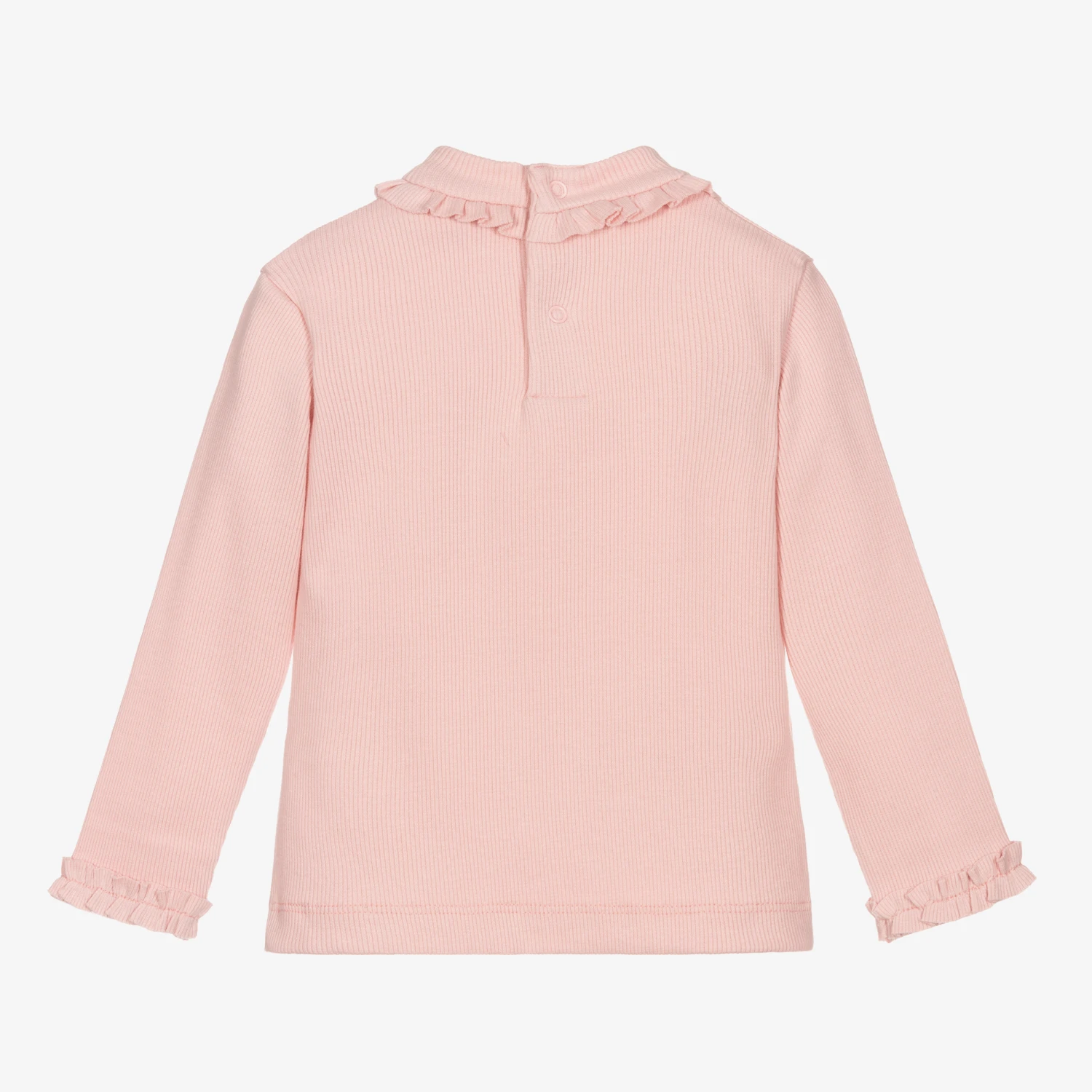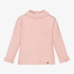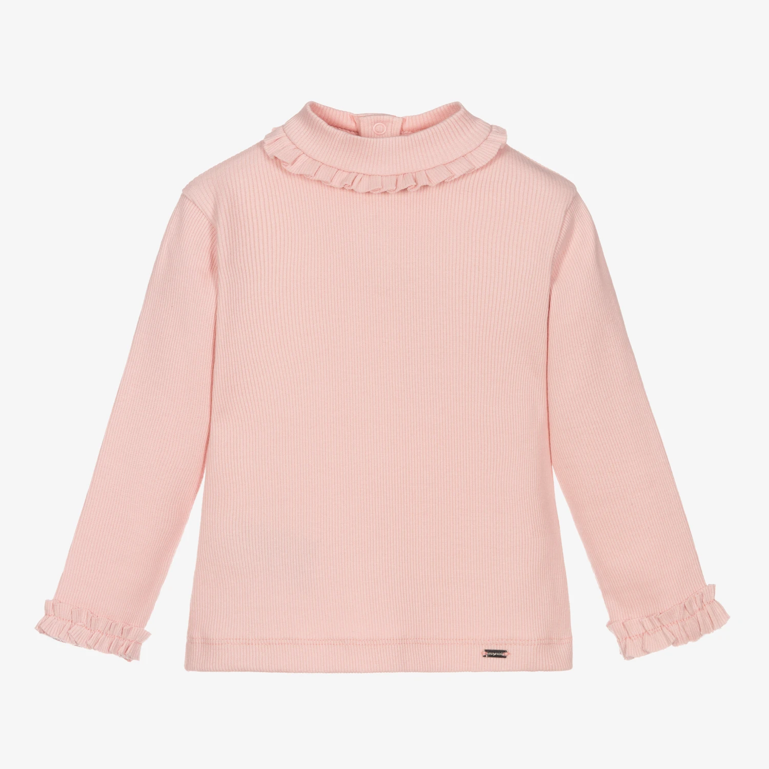 Pink ribbed turtle neck top for little girls by Mayoral, made in soft and stretchy cotton jersey. It has frill trims around the neck and cuffs. There is a silver metal logo tab by the hemline and useful popper fastenings on the back.