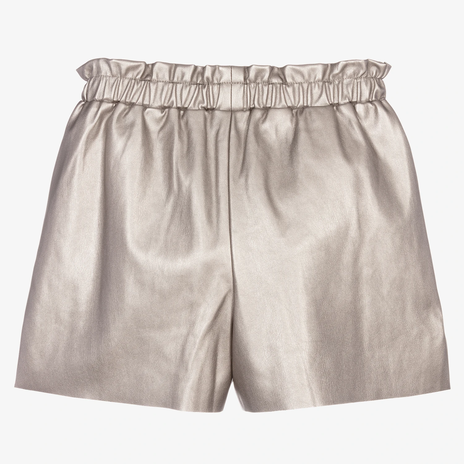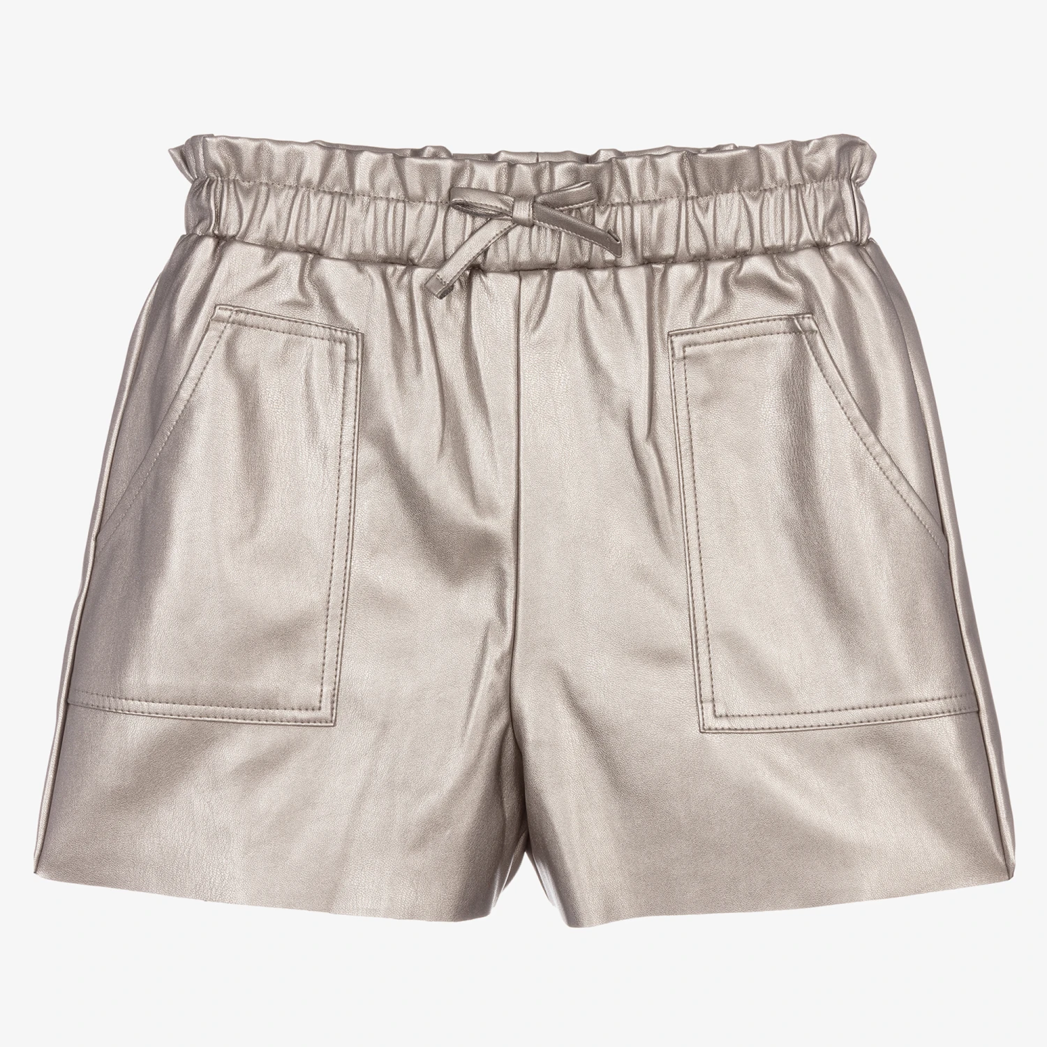 Silver soft faux leather shorts for girls from Mayoral. They have a frilled, elasticated waistband with a decorative bow, large patch pockets on the front and raw edge hems. Easy to wear, they simply pull on.