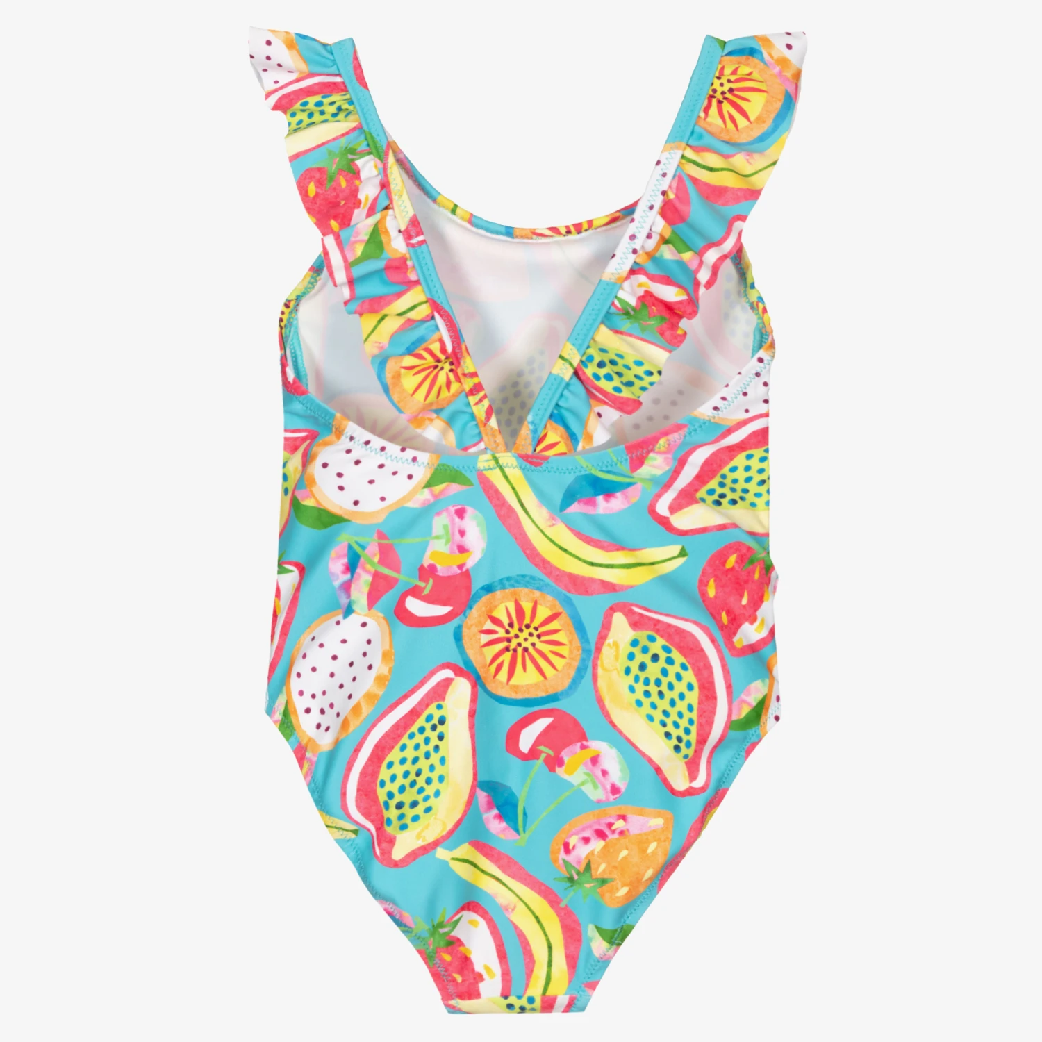 Pretty fruit print swimsuit for girls by Mayoral, in shades of blue, pink and yellow. Soft, silky and stretchy, there are lovely frill trims on the neckline and the deep scooped back.