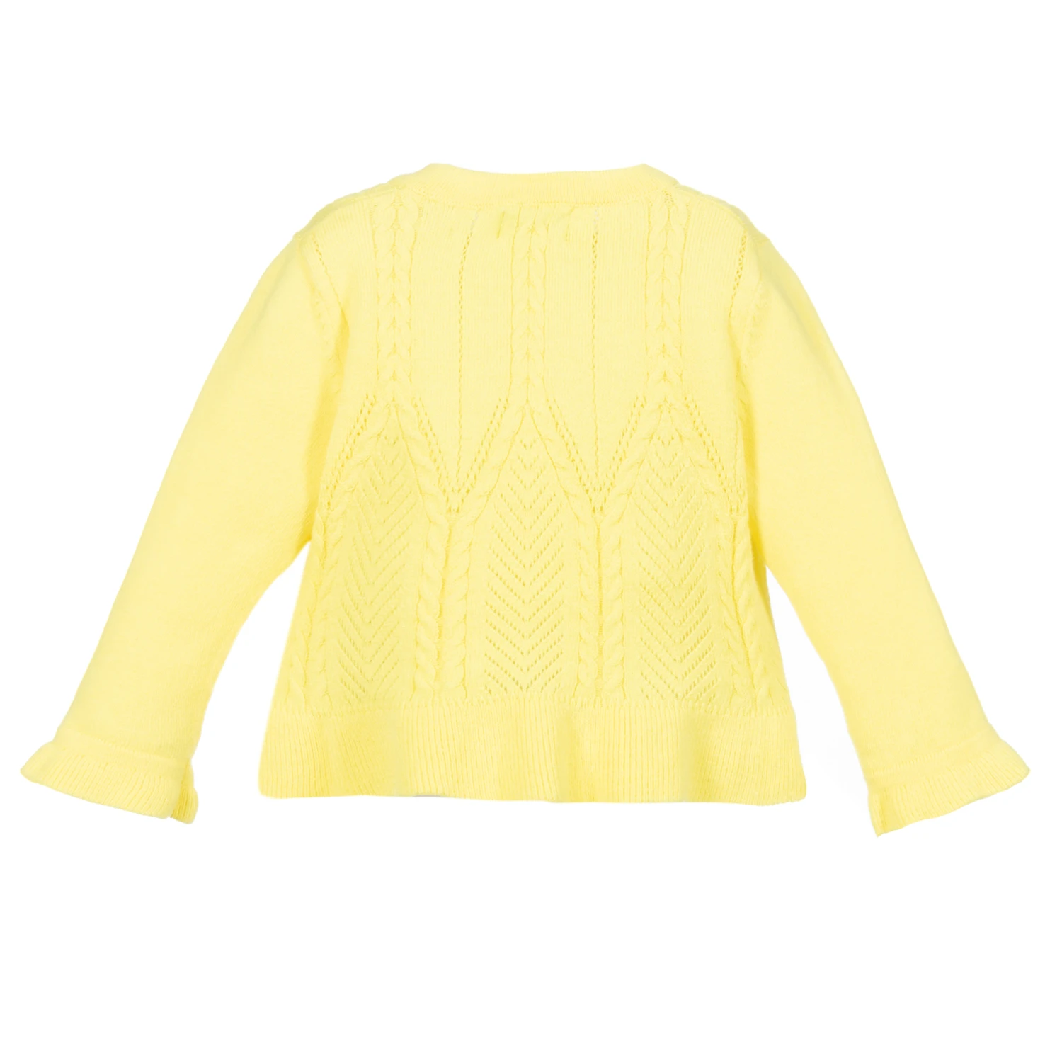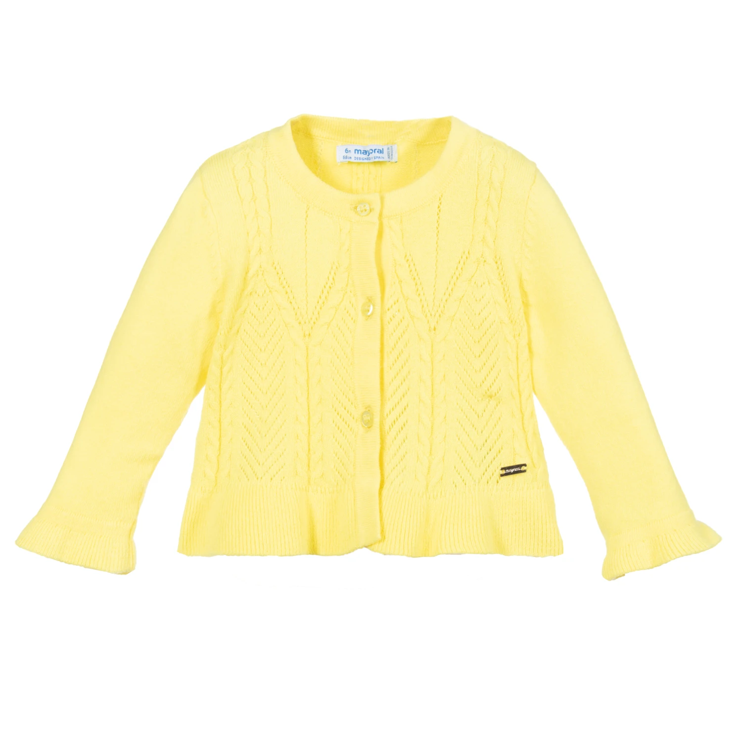 A pretty yellow cardigan for little girls by Mayoral. Made from soft and lightweight sustainable cotton, it has a lacy cable pattern in the knit. The hem and sleeves are ruffled and there is a tiny gold metal logo tab on the front.