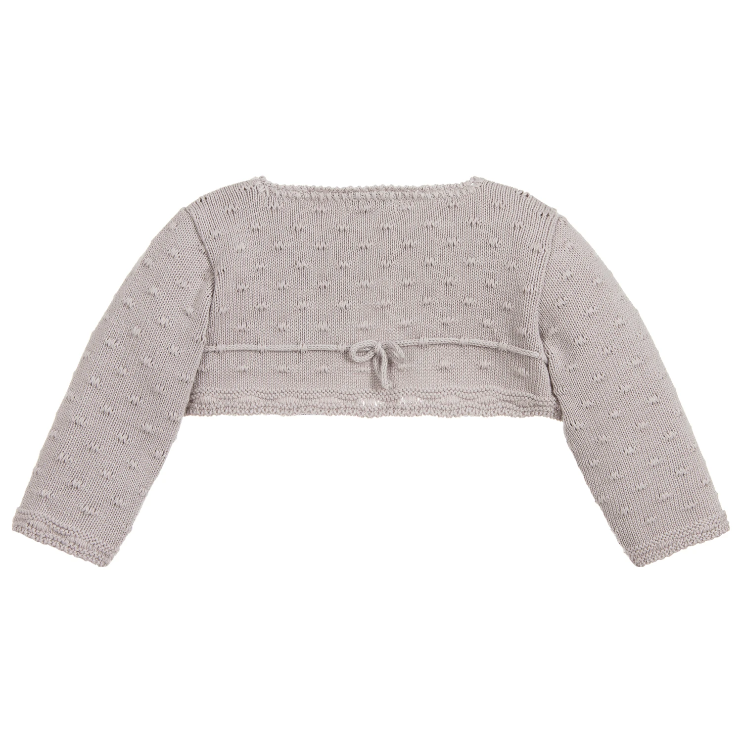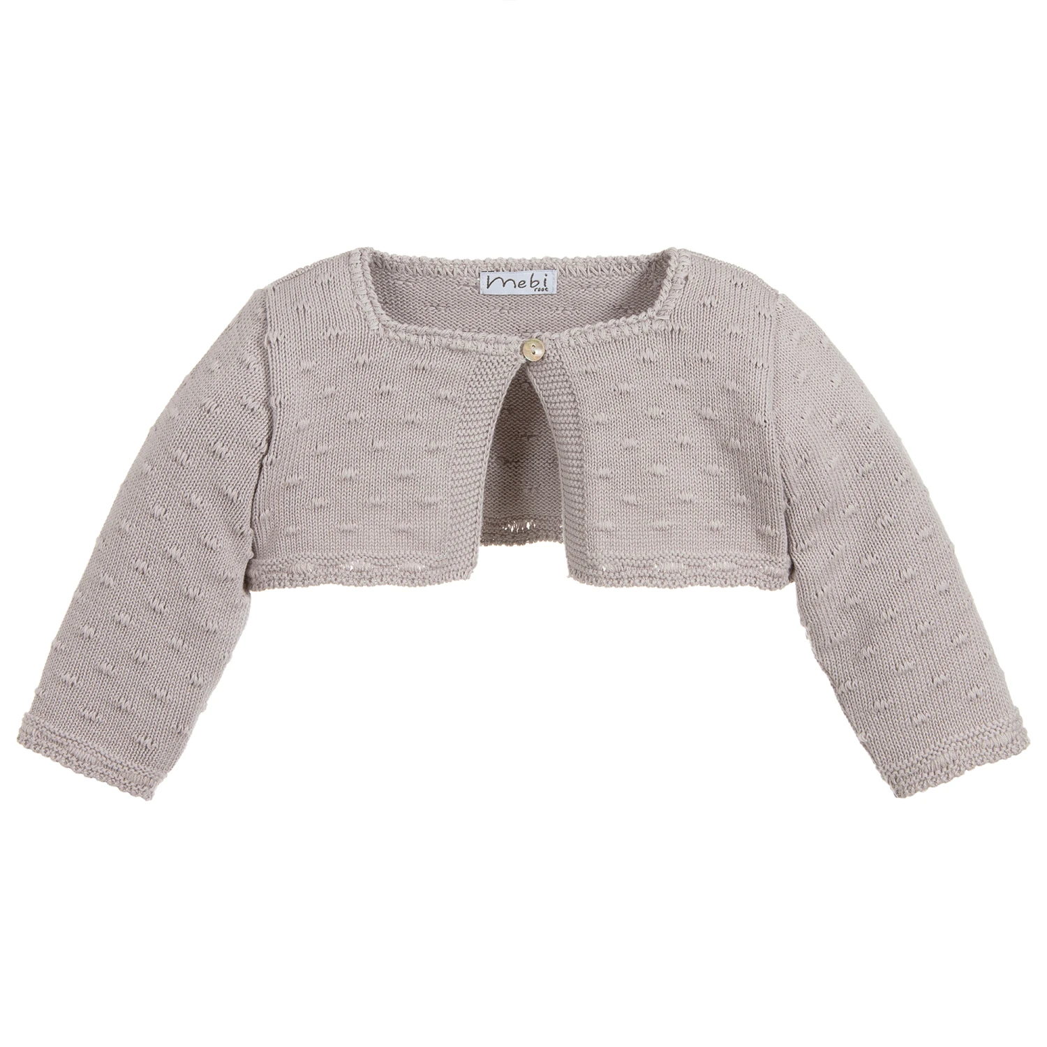 Baby girls grey bolero cardigan from Mebi. It is knitted in a soft and lightweight cotton, with a knitted dot pattern. Mebi is a small fitting brand, please choose a size up to allow room to grow.