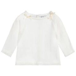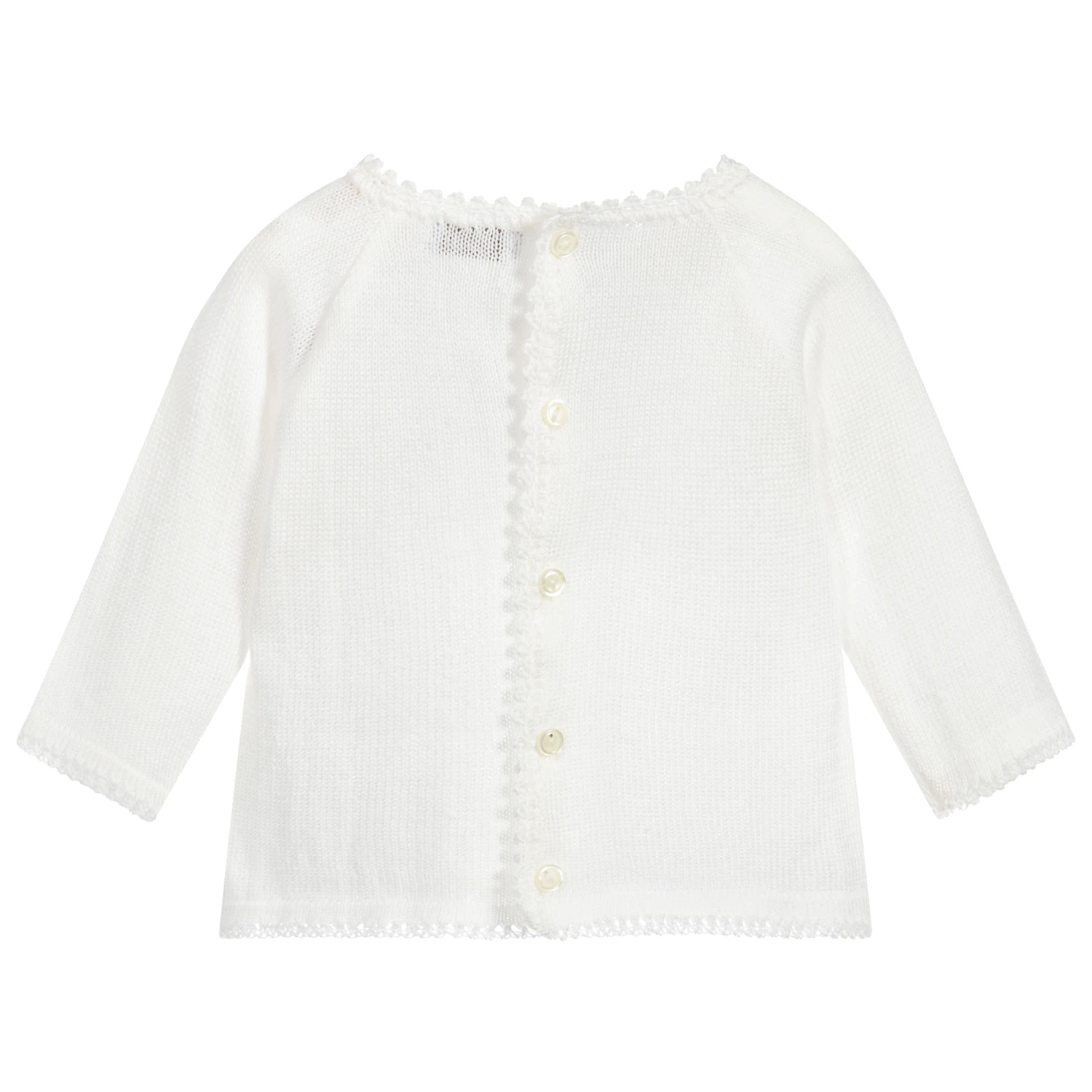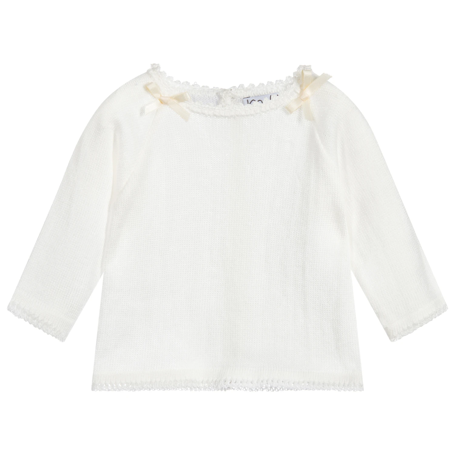 Delightful ivory sweater by Mebi, suitable for both baby boys and girls. Soft and lightweight, it is finely knitted in pure cotton with back button fastening. It has delicately woven trim along the edges and sweet ribbon bows on the neckline.