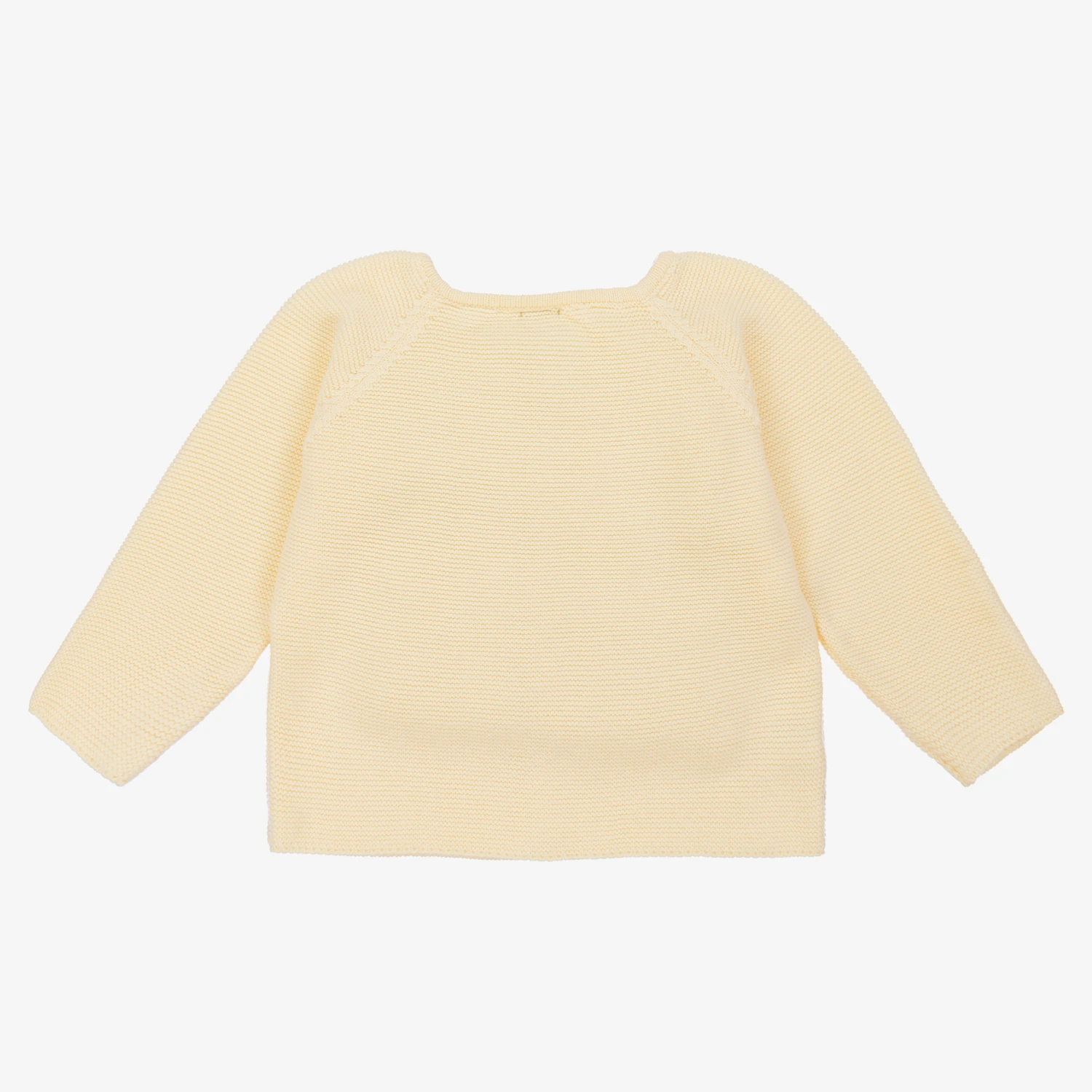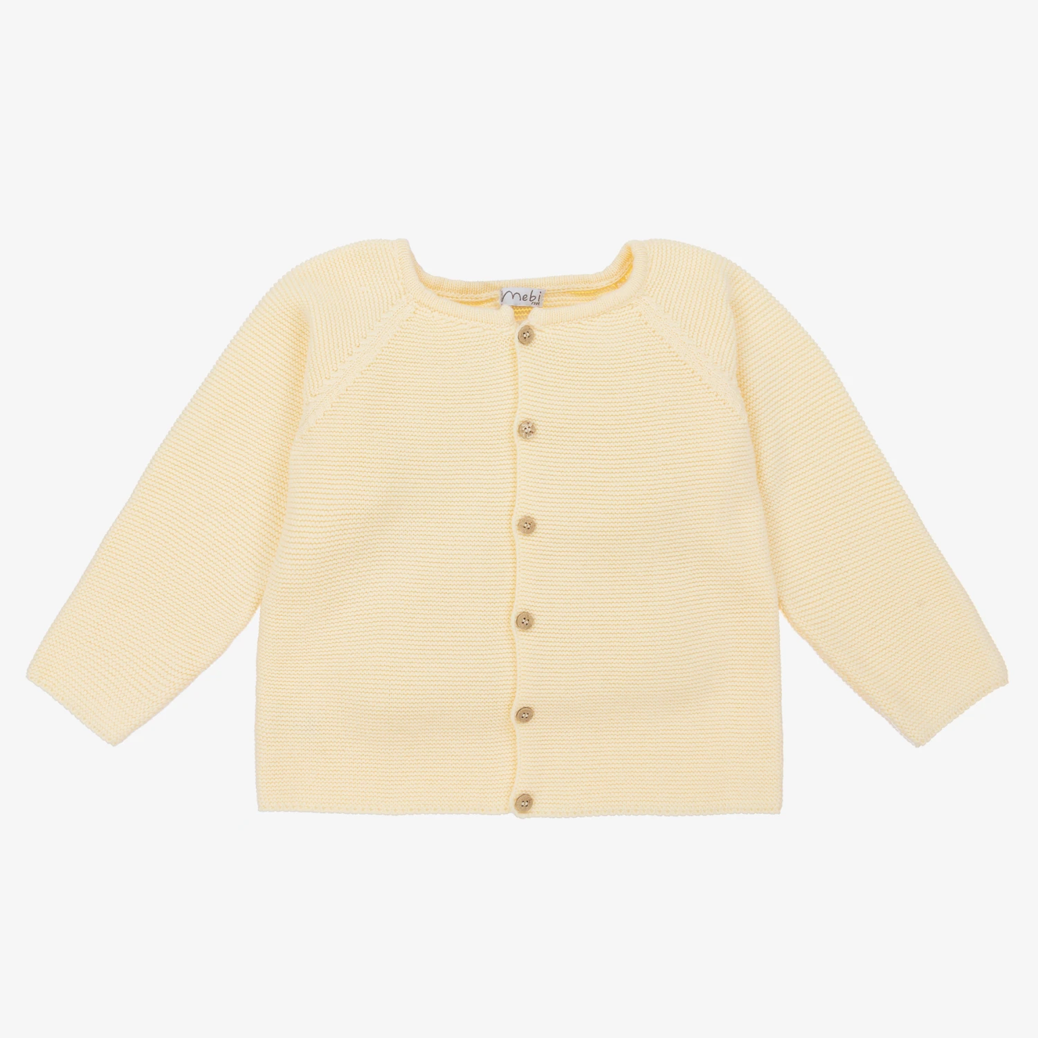 Pastel yellow cardigan for boys and girls by Mebi, finely knitted in beautifully soft cotton. Lovely for layering, it fastens with wooden buttons on the front and has cable knit trims. Mebi is a very small fitting brand, please choose a size up to allow room to grow.