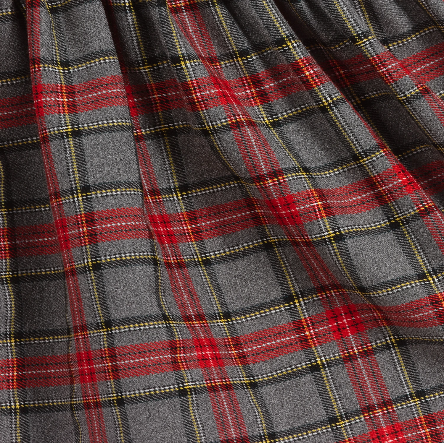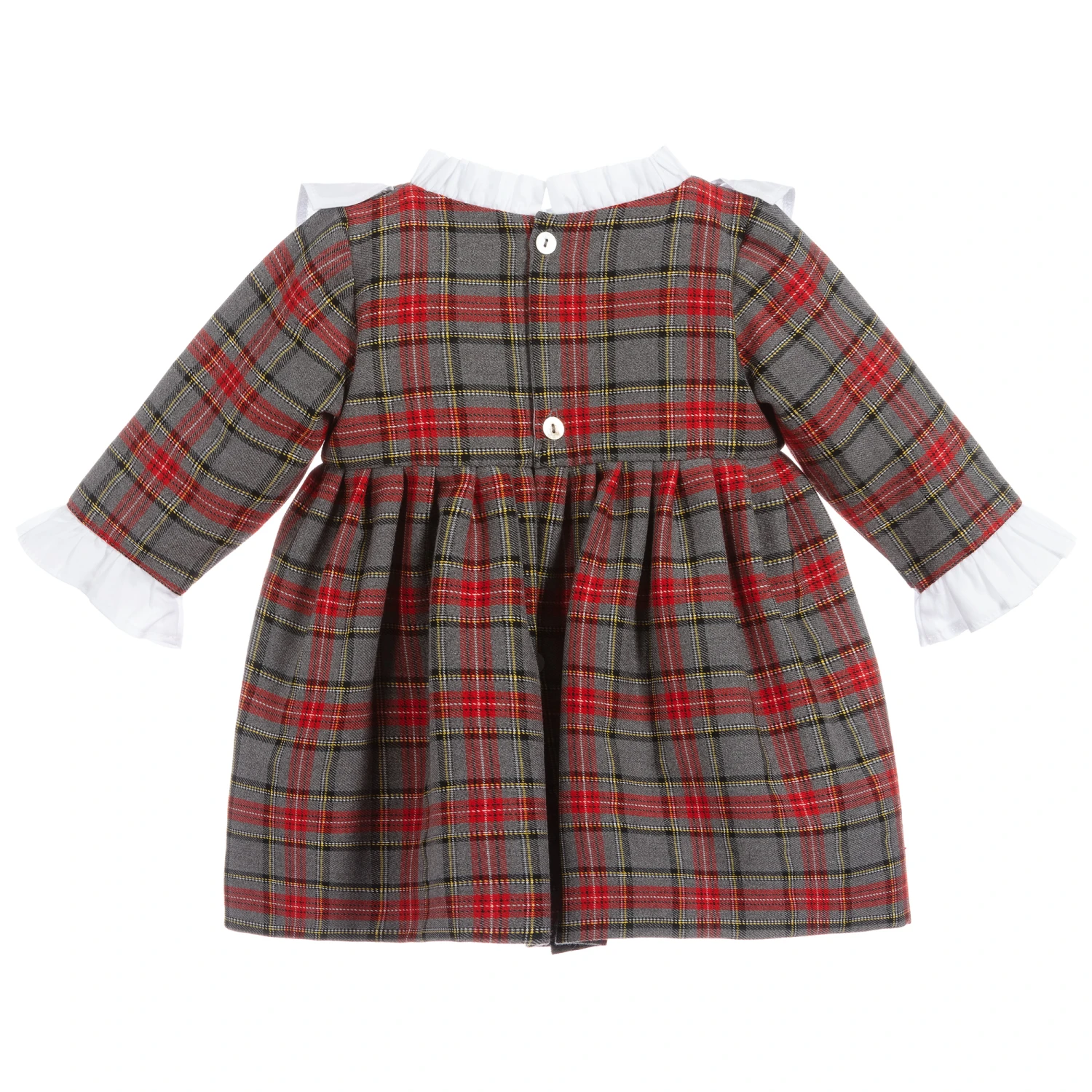 Little girls grey and red check dress by Mebi, made in a soft, brushed viscose blend. It has pretty white ruffle trim at the neck, yoke and cuffs. Lined in comfortable, lightweight cotton, with buttons to fasten on the back.