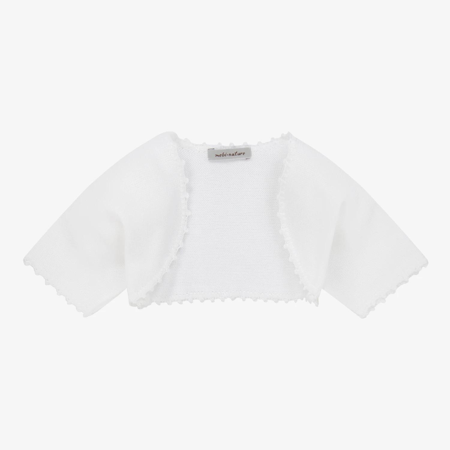 White bolero cardigan for younger girls from Mebi. Knitted in soft cotton, this open front style has patterned trims.