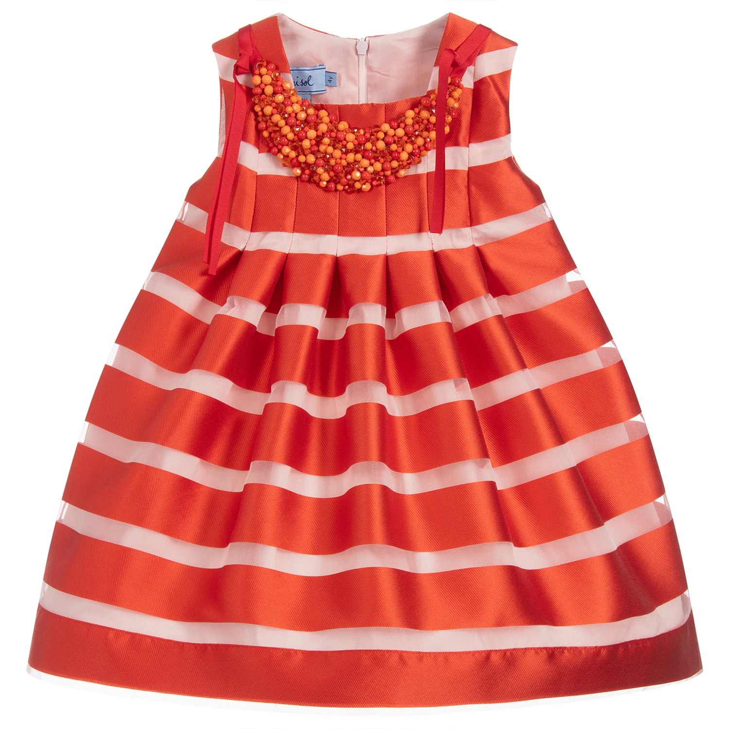 A beautiful orange dress for girls by Mi Mi Sol, in stripes of sheer chiffon and satin twill. This sleeveless design is pleated from the square neck for a full silhouette and has a lightweight, blush pink lining. The dress comes with a stunning, orange beaded neck detail that attaches with grosgrain ribbon ties.