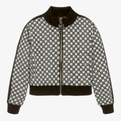 Stylish black and white checked zip-up top for girls by Michael Kors, with a contrast logo letter pattern. Mini me, it is made in soft, silky jersey with black ribbed trims for a comfortable wear. There are sporty black stripes along the sleeves and useful concealed front pockets. The top is slightly cropped in length and has an exposed silver zip fastening with a branded metal pull for a luxurious finish.