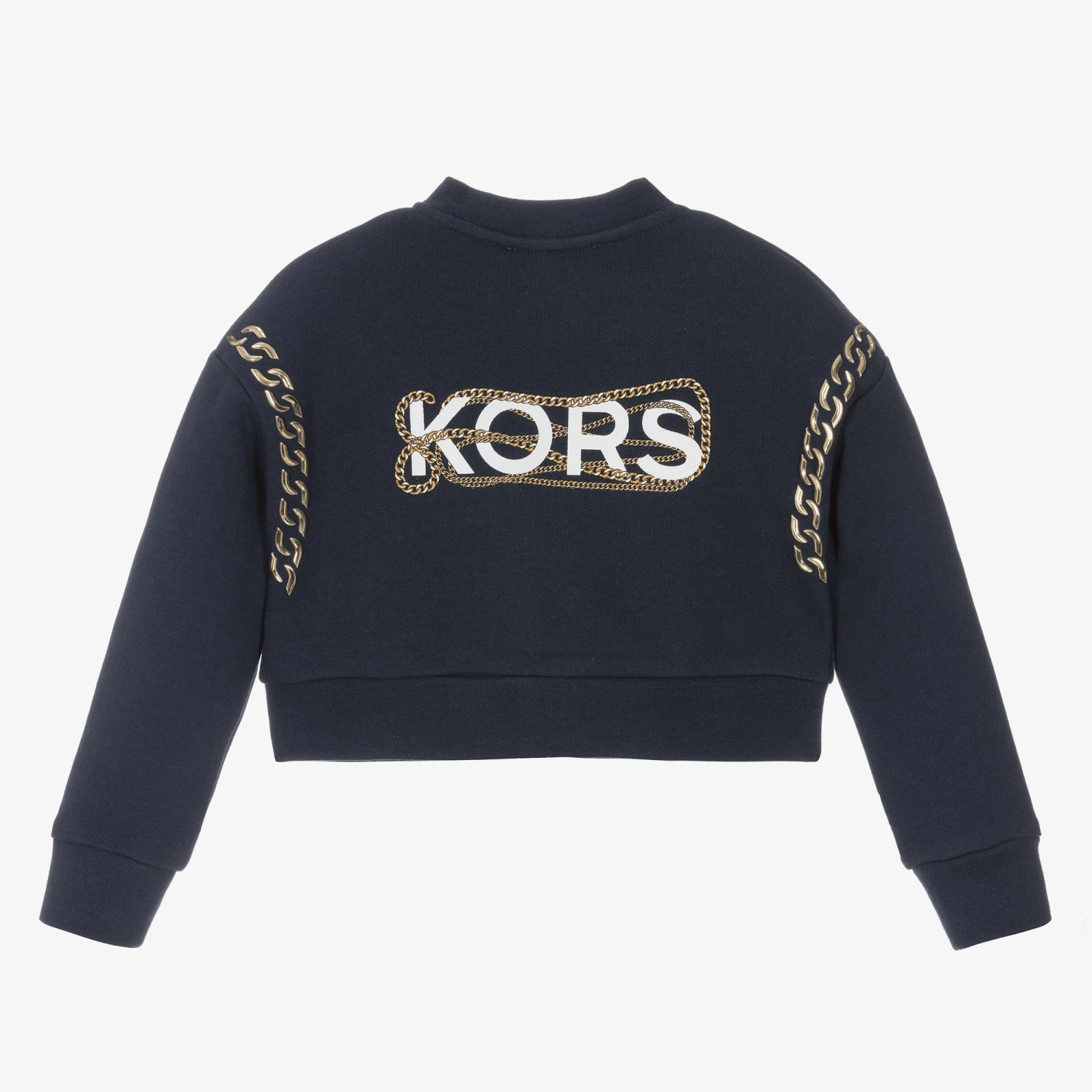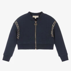 A navy blue zip-up top for girls by Michael Kors, made in soft, mid-weight cotton jersey with a looped underside. Edgy and eye-catching, it has gold metal detailing around the arms, with a white chain logo printed on the back.