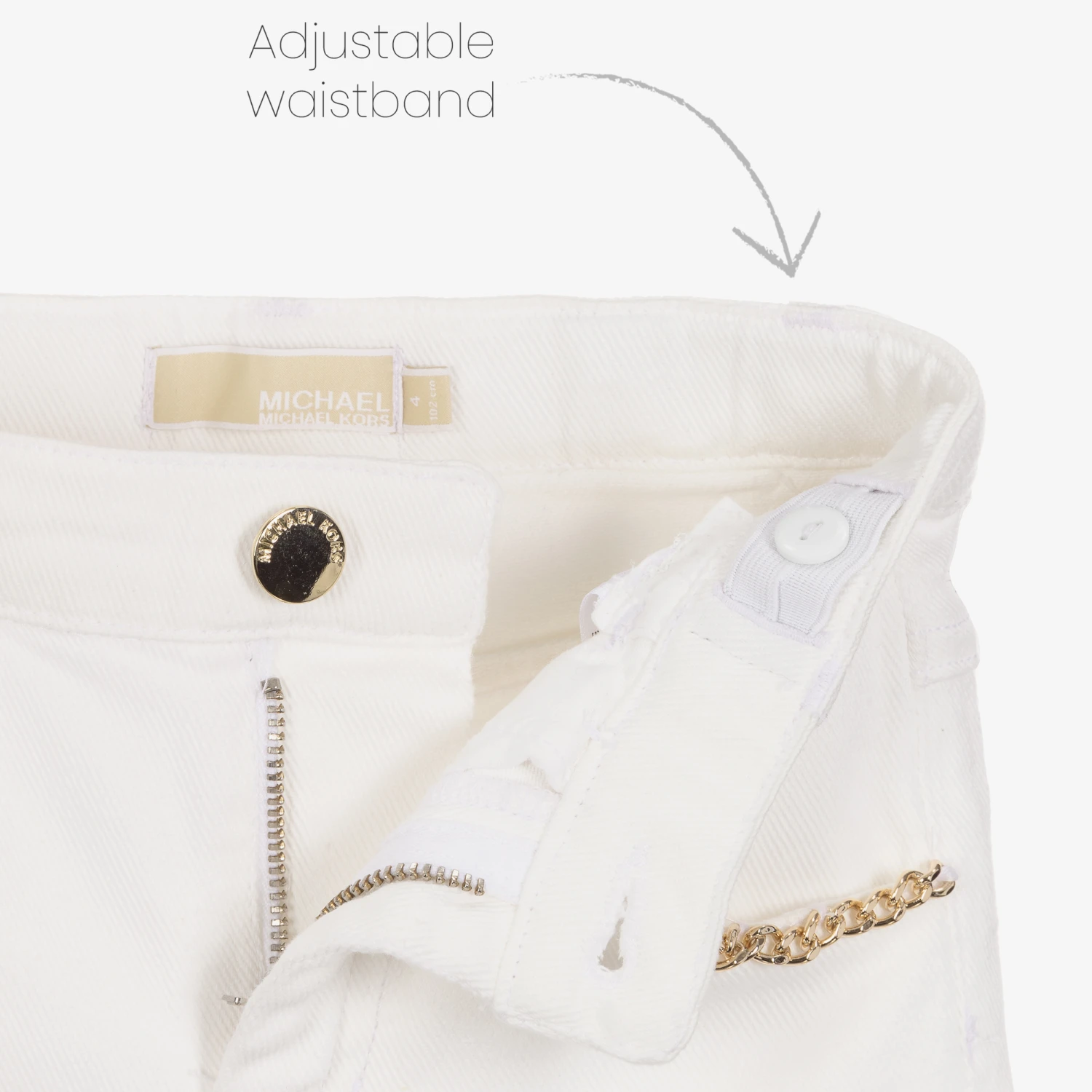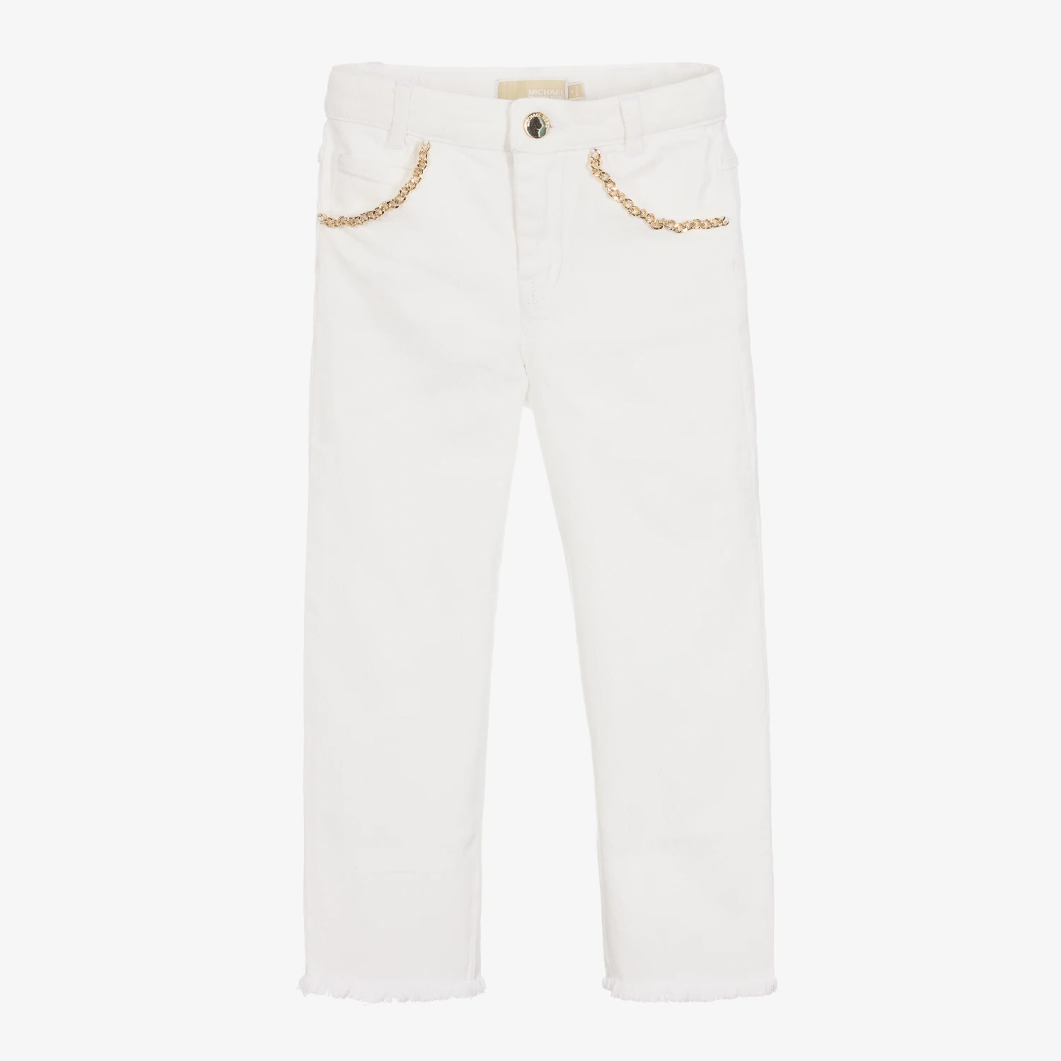 Ivory denim jeans for girls by Michael Kors, made in soft cotton with slight stretch. Edgy and modern, they have classic five-pocket styling, with gold chains on the front, and a metal logo on the back. They fasten with a gold button and zip fastening, and have an adjustable waist for a gorgeous fit.