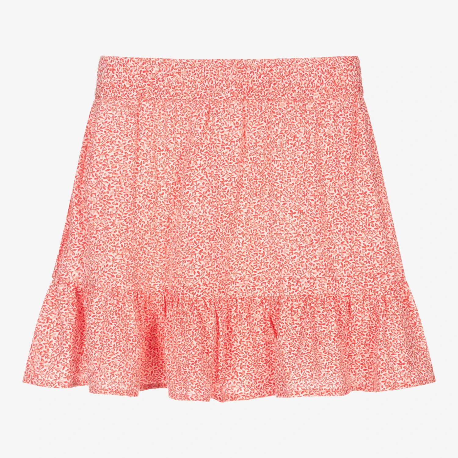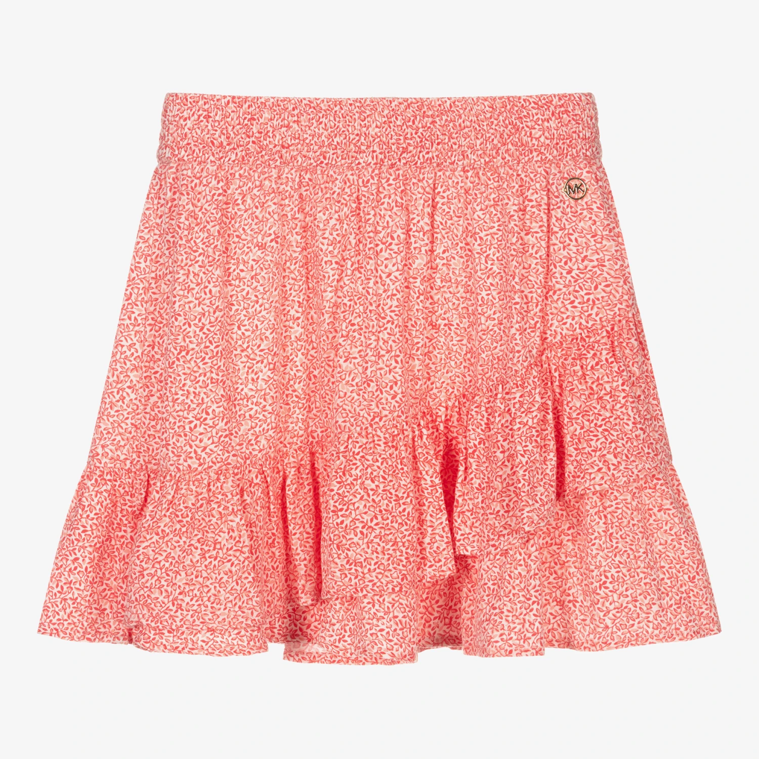 Lovely red skirt for girls by luxury American designer Michael Kors. Made in lightweight viscose twill, it has an elasticated waistband and an asymmetrical frill on the hemline. It has a shiny gold logo charm sewn on one side.