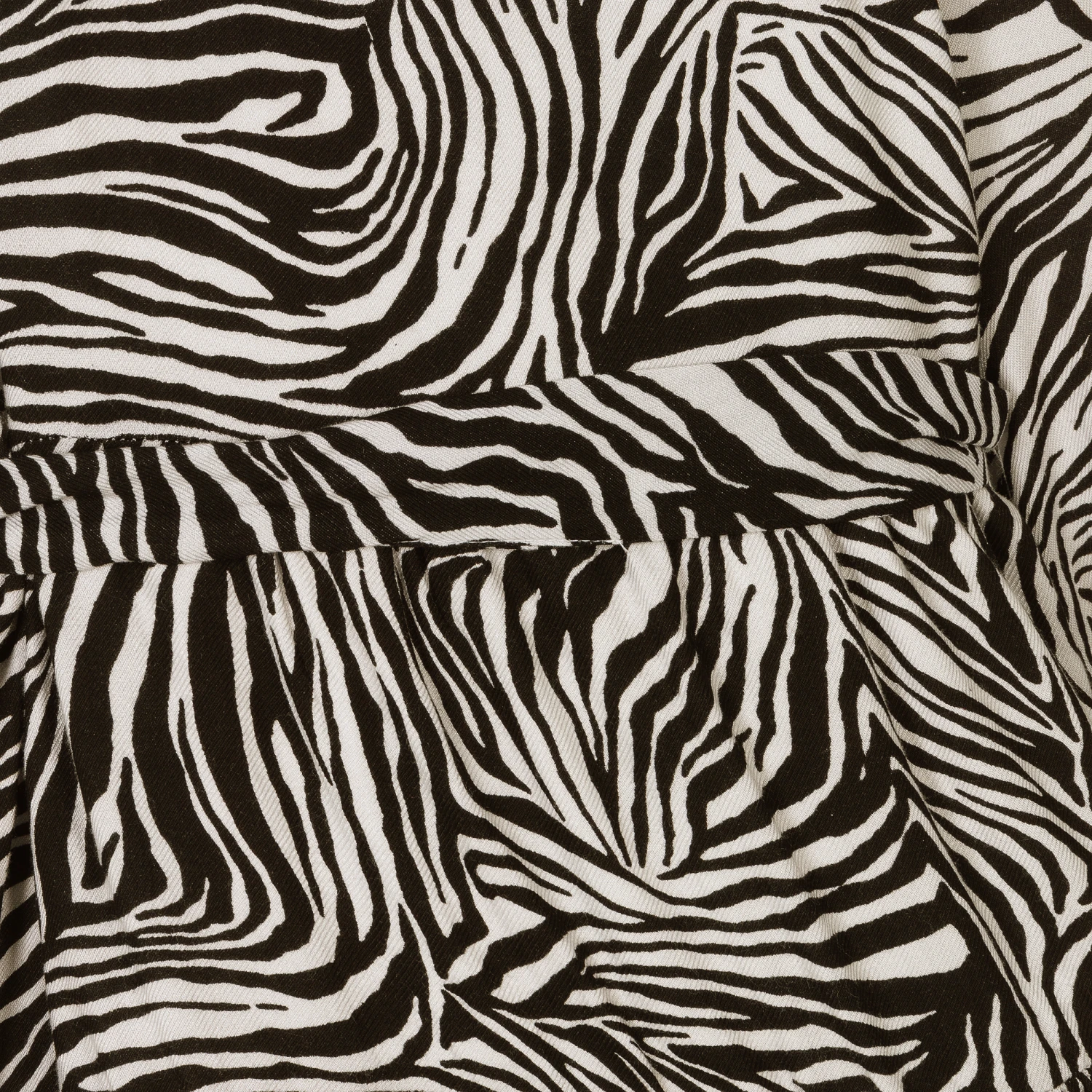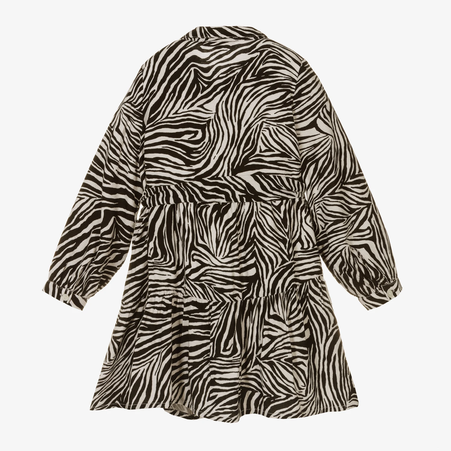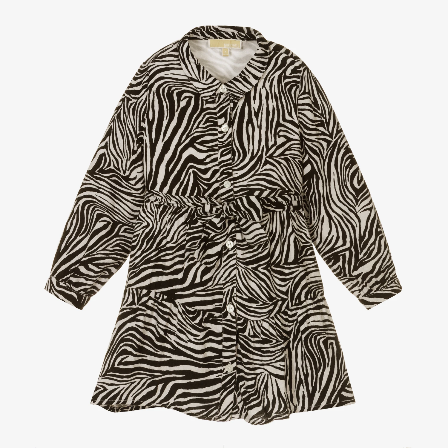 An ivory and black Michael Kors shirt dress for girls, made and lined in lightweight viscose. This statement design has an all-over zebra print pattern, with branded front button fastenings, a tiered skirt and a silver metal logo charm near the front hem. It comes with a matching belt to tie around the waist, which is removable to change up your look.