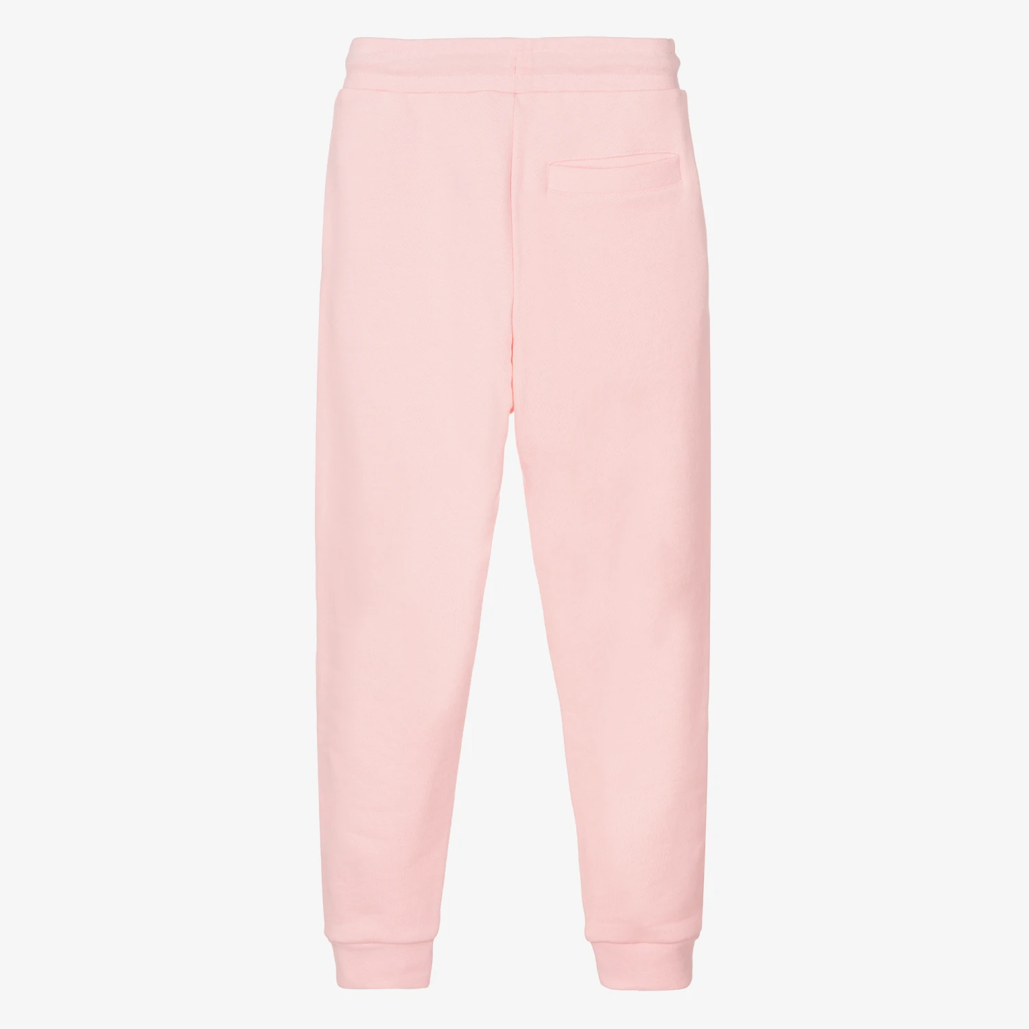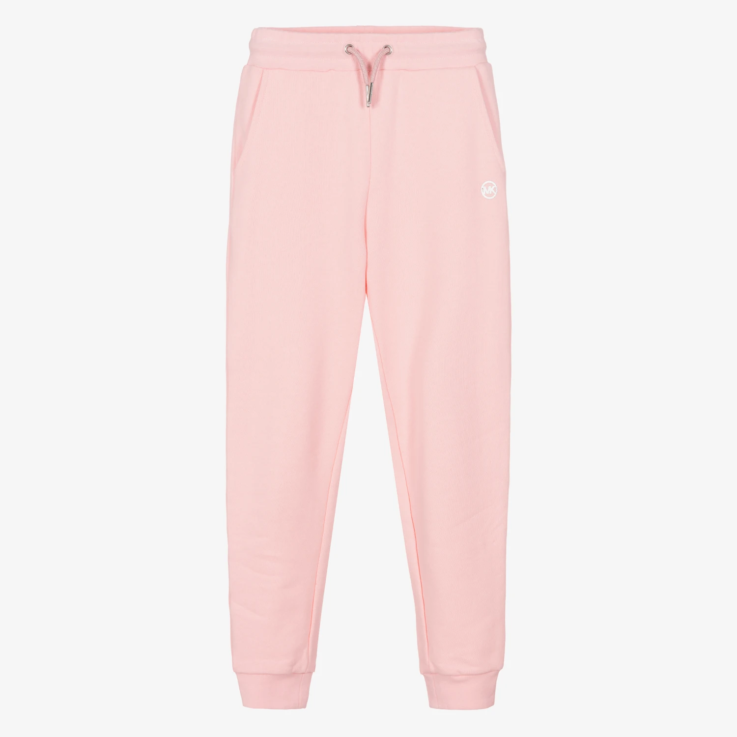 Pink cotton joggers for teen girls by American brand Michael Kors, made in soft sweatshirt jersey. They have a small silver foil monogram logo on the front and a drawstring waist with branded silver end caps for a discreet designer look. A classic style with cuffed ankles, they have useful slanted front pockets and a single pocket on the back.