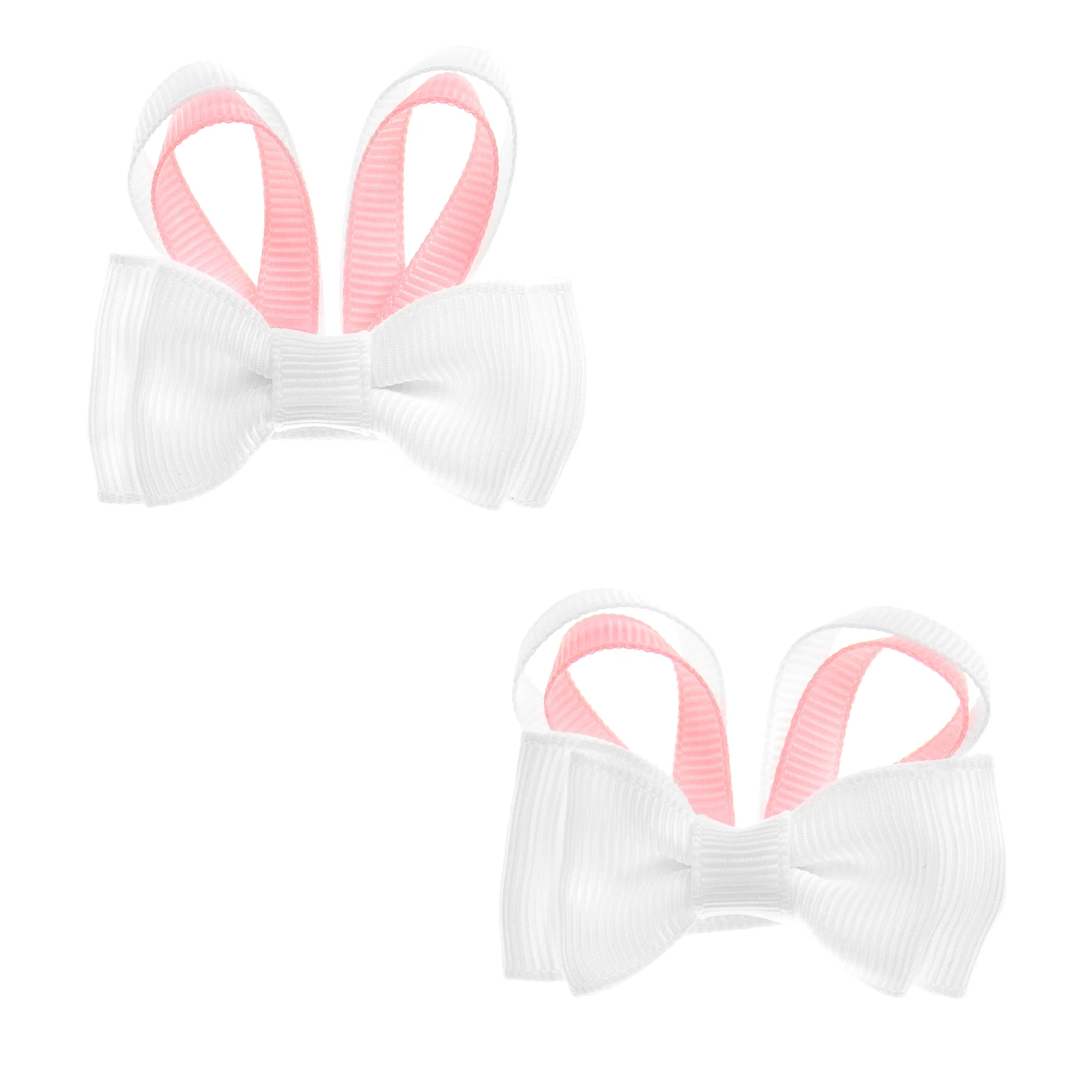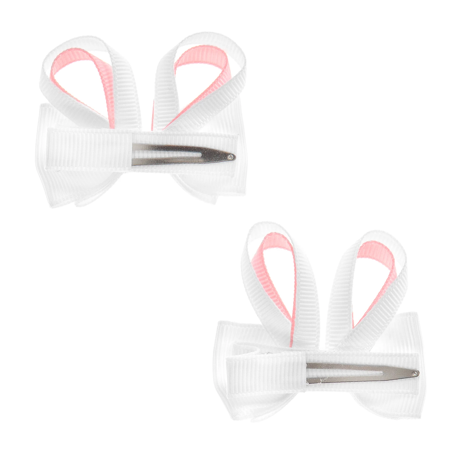 Girls set of two ribbon bow hairclips from Milledeux. Made with grosgrain ribbon in pink and white, they have sweet bunny ‘ears’ on the top and secure to the head with a metal clip.