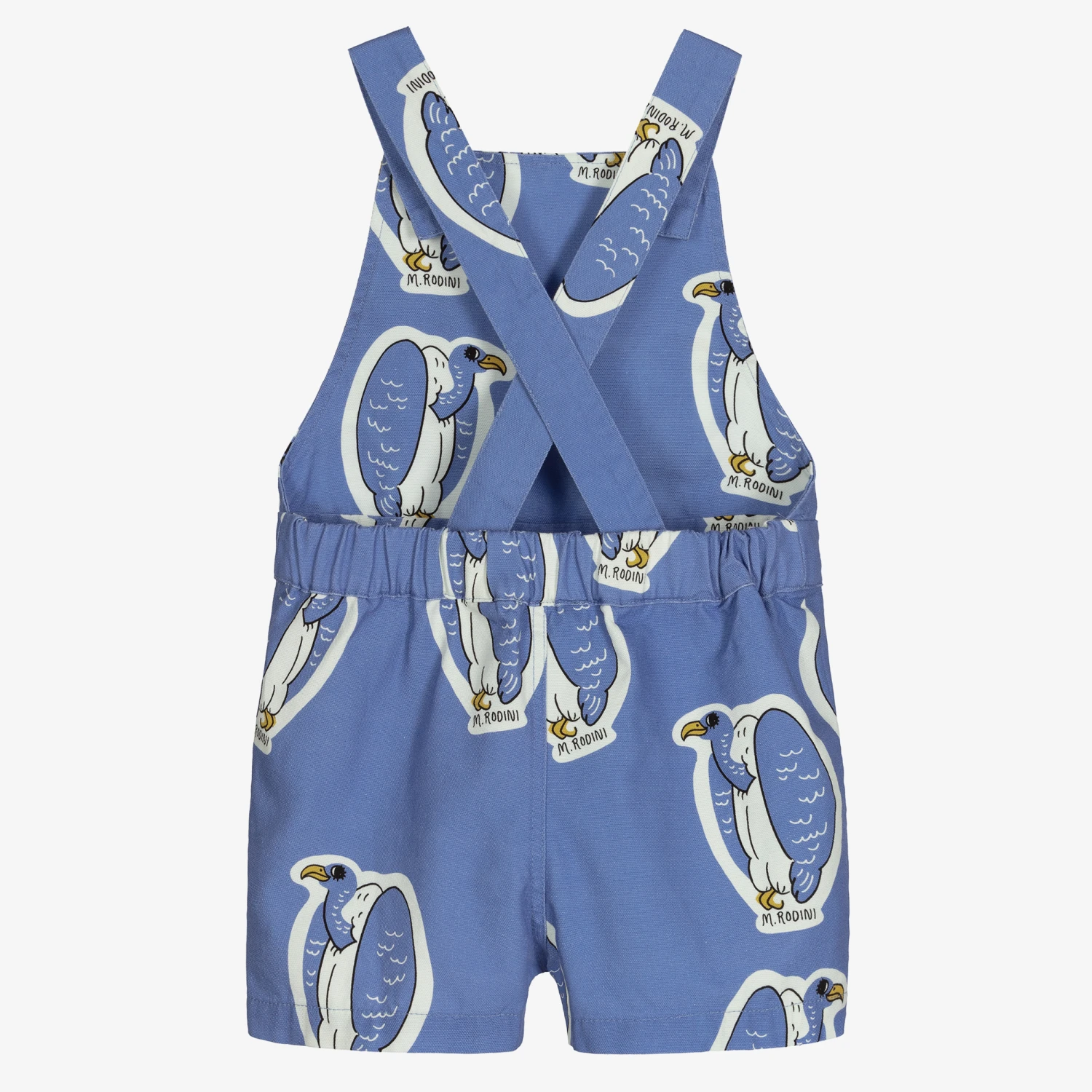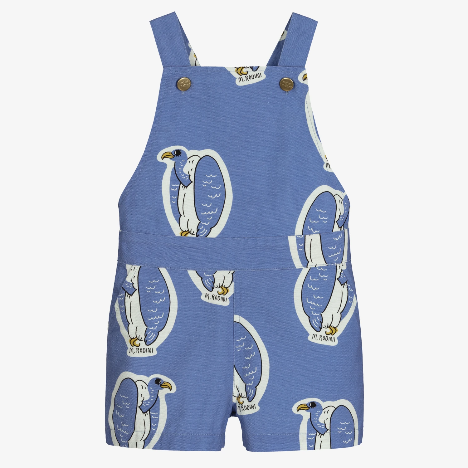 Blue dungaree shorts for boys and girls by Mini Rodini. They are woven in mid-weight organic cotton, with an all-over vulture print. They have button-fastening, adjustable shoulder straps and slanted side pockets. The waistband is elasticated around the back.