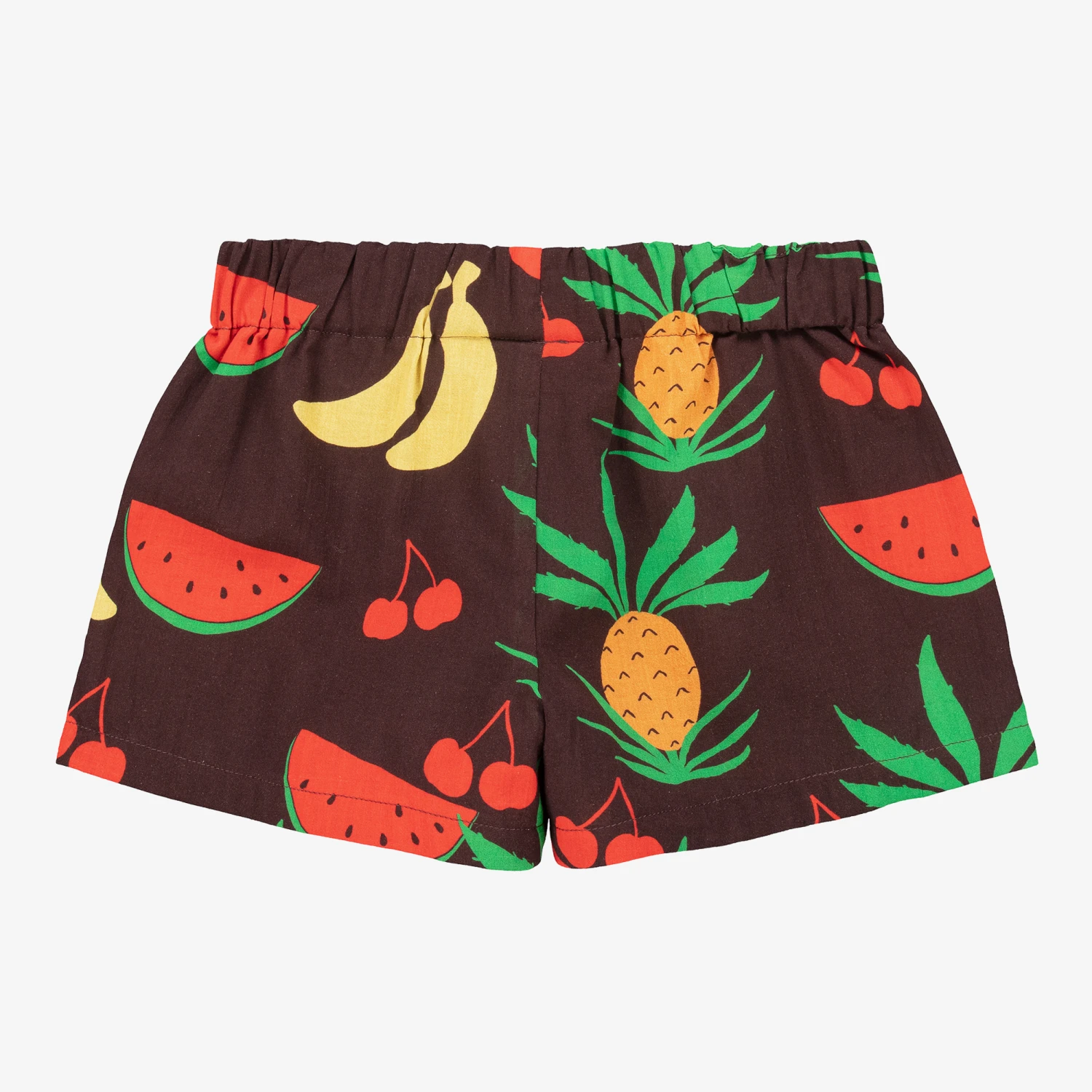 Fun brown shorts for boys and girls by Mini Rodini, made in sheer, lightweight organic cotton. Cool and comfortable they are patterned with a colourful fruit print and have an internal drawstring waist and a lightweight lining.
