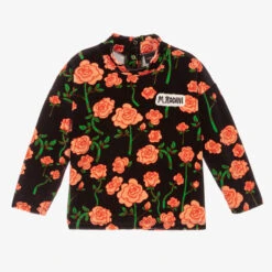 Soft and comfortable for girls, a black turtle neck top from Mini Rodini, with a bright pink and green rose print. Made in cosy organic cotton velour, it has a white and black logo patch on the chest and popper fastenings on the back.